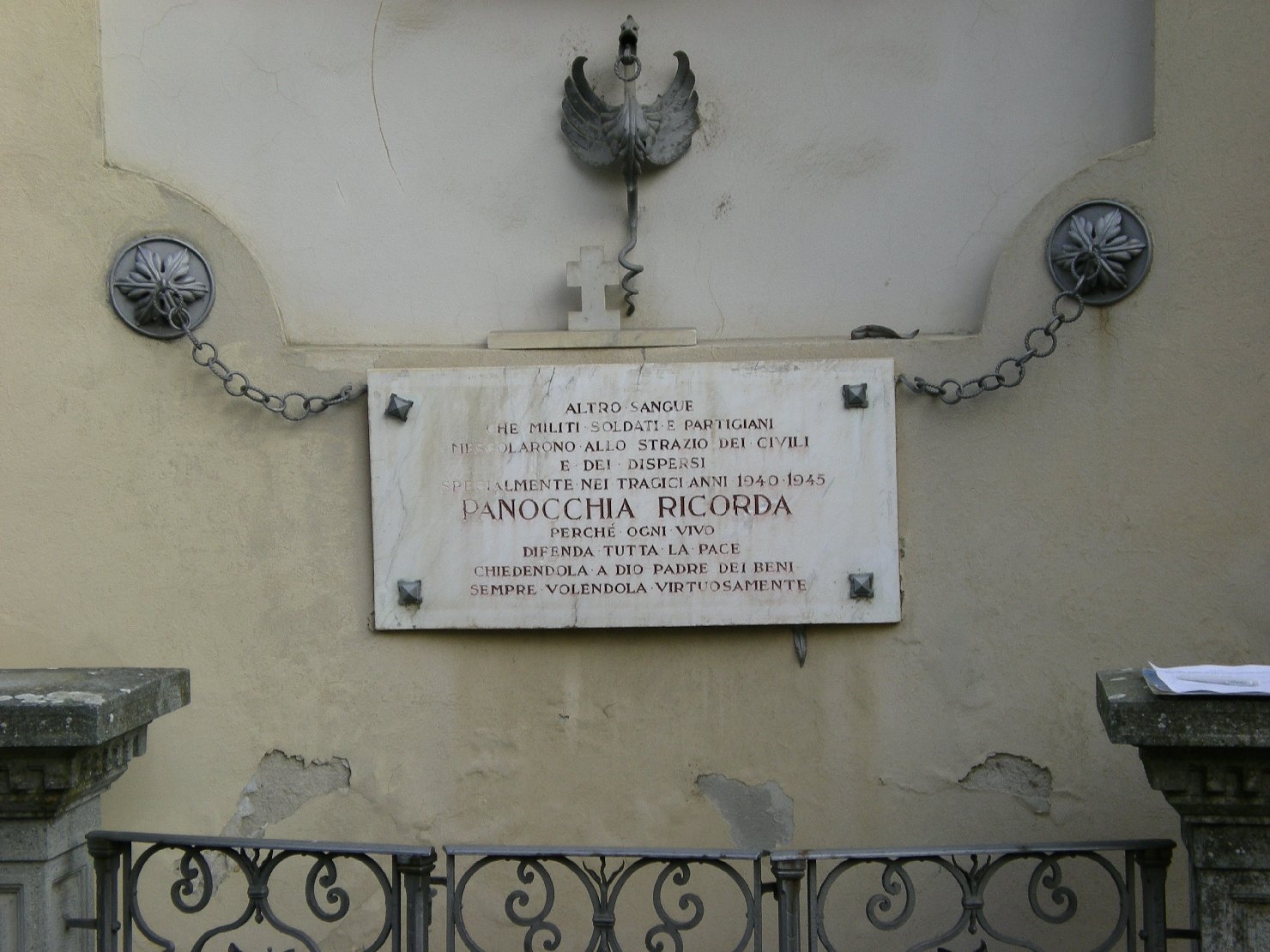 - ISCRIZIONI al centro, a tutto campo - PANOCCHIA AI SUOI FIGLI/ TEN. CHIARI GIACOMO/ CAP. M. MOTTA VITTORIO/ SOLD. PARENTI GIACOMO/ " TEGONI ADOLFO/ " ORLANDINI ANTONIO/ " PITALOBI NESTORE/ " SCHIANCHI GIUSEPPE/ " CAVALLI ROBERTO/ " TARASCONI GILDO/ " PADOVANI MARIO/ " LEONI ALFREDO/ SOLD. BELLENGHI LAZZARO/ " FERRONI MARCELLO/ " GAMBARELLI ALFREDO/ " MORA EUGENIO/ " STOCCHI ALFREDO/ " ROSSELLI PARIDE/ " GRECI CLEMENTE/ " ZAMBRELLI EMILIO/ " BUSSI AGOSTINO/ " COTTI ALFREDO/ " CERESINI ALFREDO/ DAL 1915 AL 1918 COMBATTERONO E CADDERO PER LA LIBERTA' D' ITALIA/ RIFULGONO I LORO NOMI/ DELLA COSTANZA DEL DOLORE DELL'EROISMO DEI FORTI/ E PASSANO DI GENERAZIONE IN GENERAZIONE/ AMMONENDO/ DIO [- - -] PATRIA/ FU IL TRINON [- - -] LORO AMORE/ APRILE 1920 - lettere capitali -