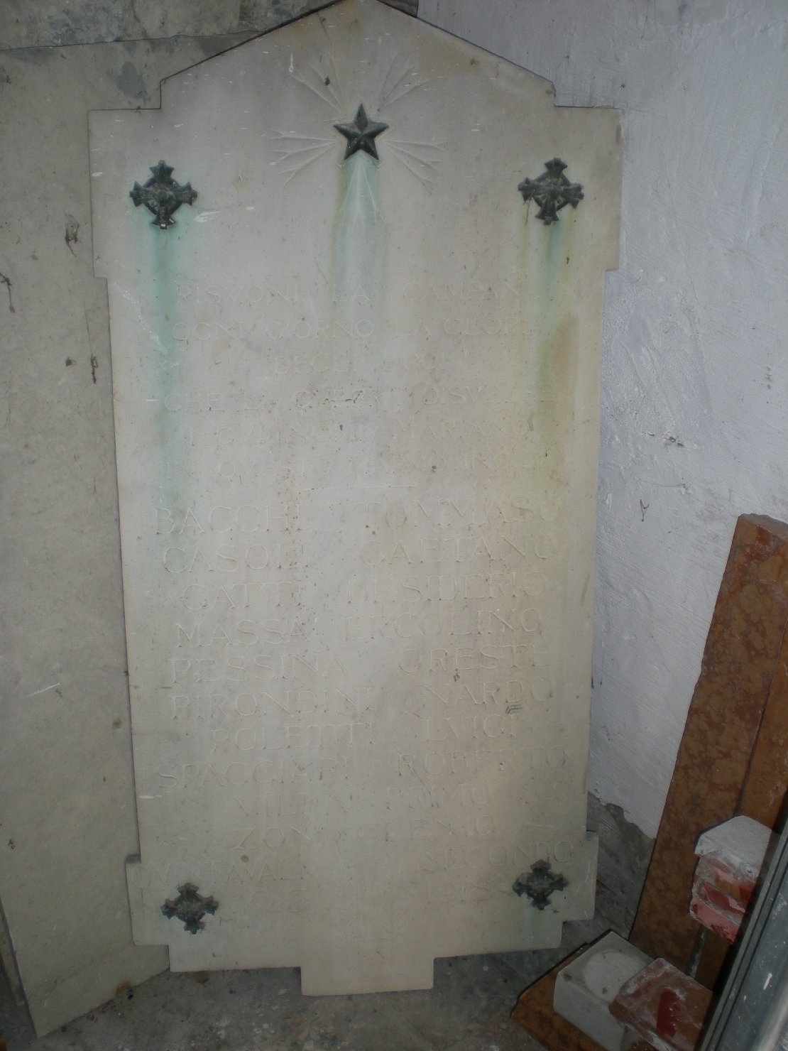- ISCRIZIONI al centro, a tutto campo - RISUONI LA CAMPANA/ OGNI GIORNO LA GLORIA/ DEGLI EROI/ CHE LA GUERRA DISVELSE/ I CUI NOMI MARIANO/ IN QUESTO MARMO INCISE/ BACCHI TOMMASO/ CASOLI GAETANO/ GATTI DESIDERIO/ MASSA ERCOLINO/ PESSINA ORESTE/ PIRONDINI NARDO/ POLETTI LUIGI/ SPAGGIARI ROBERTO/ VILLA PRIMO/ ZONI CLENIO/ QUINTAVALLA SECONDO/ 1915 1918/ ITALO DE [- - -] - lettere capitali -