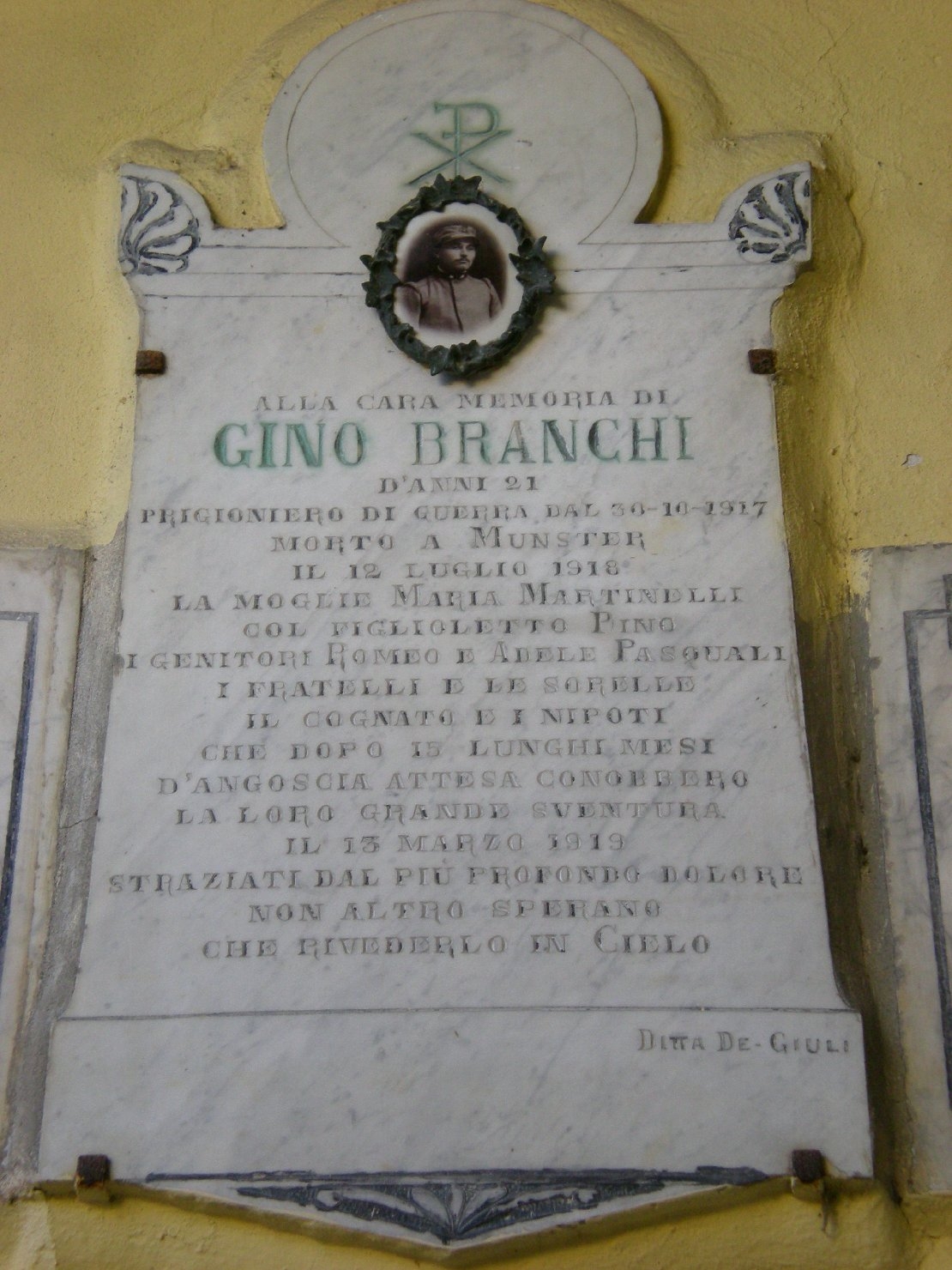• ISCRIZIONI al centro, a tutto campo - ALLA MEMORIA DI/ GINO BRANCHI/ D'ANNI 21/ PRIGIONIERO DI GUERRA DAL 30-10-1917/ MORTO A MUNSTER/ IL 12 LUGLIO 1918/ LA MOGLIE MARIA MARTINELLI/ COL FIGLIOLETTO PINO/ I GENITORI ROMEO E ADELE PASQUALI/ I FRATELLI E LE SORELLE/ IL COGNATO E I NIPOTI/ CHE DOPO 15 LUGNHI MESI/ D'ANGOSCIA ATTESA CONOBBERO/ LA LORO GRANDE SVENTURA/ IL 13 MARZO 1919/ STRAZIATI DAL PIU' PROFONDO DOLORE/ NON ALTRO SPERANO/ CHE RIVEDERLO IN CIELO/ DITTA DE. GIULI - lettere capitali - a solchi -