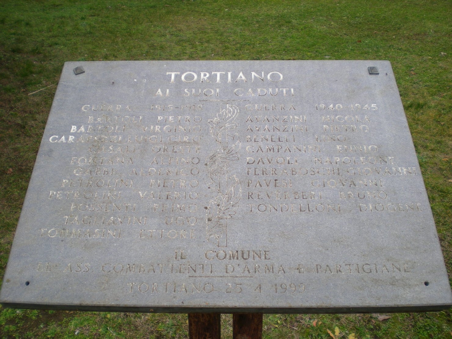 - ISCRIZIONI al centro, a tutto campo - TORTIANO/ AI SUOI CADUTI/ GUERRA 1915-1918/ BARTOLI PIETRO/ BARTOLI VIRGINIO/ CARAPEZZI LUIGI CIRO/ CASALI ORESTE/ FONTANA ALPINO/ GABBI ALDERICO/ PETROLINI PIETRO/ PETROLINI VALERIO/ POSSENTI PRIMO/ TAGLIAVINI UGO/ TOMMASINI ETTORE/ GUERRA 1940-1945/ AVANZINI NICOLA/ AVANZINI PIETRO/ BENELLI LINO/ CAMPANINI ENNIO/ DAVOLI NAPOLEONE/ FERRABOSCHI GIOVANNI/ PAVESI GIOVANNI/ REVERBERI BRUNO/ TONDELLONI DIOGENE/ IL COMUNE/ ASS. COMBATTENTI D'ARMA E PARTIGIANE/ TORTIANO 25 4 1999 - lettere capitali -