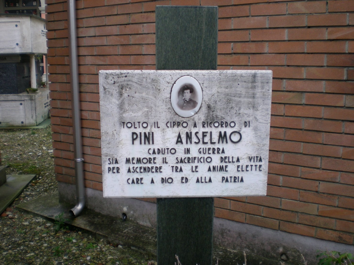 - ISCRIZIONI al centro, a tutto campo - TOLTO IL CIPPO DI/ PINI ANSELMO/ CADUTO IN GUERRA/ SIA MEMORE IL SACRIFICIO DELLA VITA/ PER ASCENDERE TRA LE ANIME ELETTE/ CARE A DIO ED ALLA PATRIA - lettere capitali - a caratteri applicati -