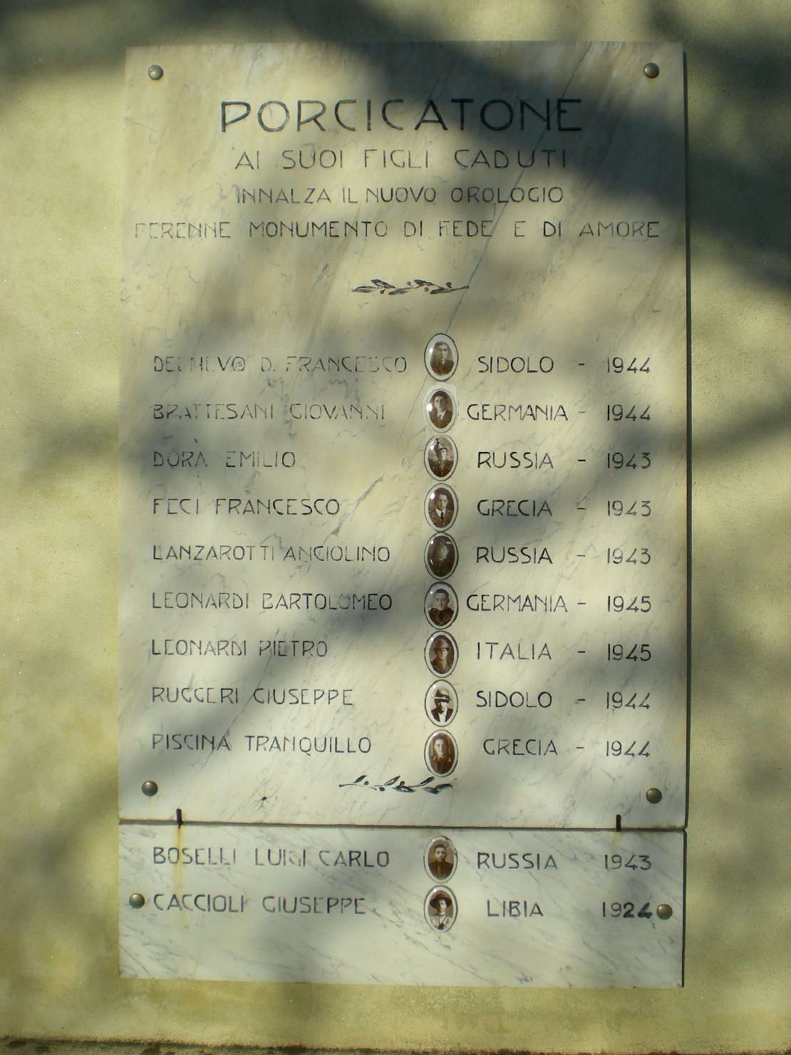 - ISCRIZIONI al centro, a tutto campo - PORCIGATONE/ AI SUOI FIGLI CADUTI/ INNALZA IL NUOVO OROLOGIO/ PERENNE MONUMENTO DI FEDE E DI AMORE/ DEL NEVO D. FRANCESCO SIDOLO - 1944/ BRATTESANI GIOVANNI GERMANIA - 1944/ DORA' EMILIO RUSSIA - 1943/ FECI FRANCESCO GRECIA - 1943/ LANZAROTTI ANGIOLINO RUSSIA - 1943/ LEONARDI BARTOLOMEO GERMANIA - 1945/ LEONARDI PIETRO ITALIA - 1945/ RUGGERI GIUSEPPE SIDOLO - 1944/ PISCINA TRANQUILLO GRECIA - 1944/ BOSELLI LUIGI CARLO RUSSIA 1943/ CACCIOLI GIUSEPPE LIBIA 1924 - lettere capitali - a caratteri applicati -