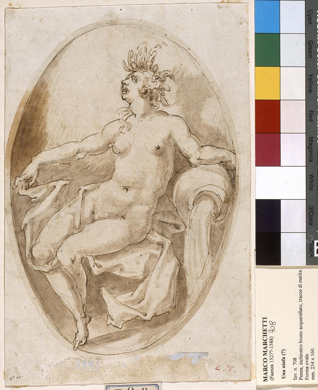 Una ninfa seduta, sotto il braccio sinistro un'anfora che versa acqua. A inchiostro grigio-bruno