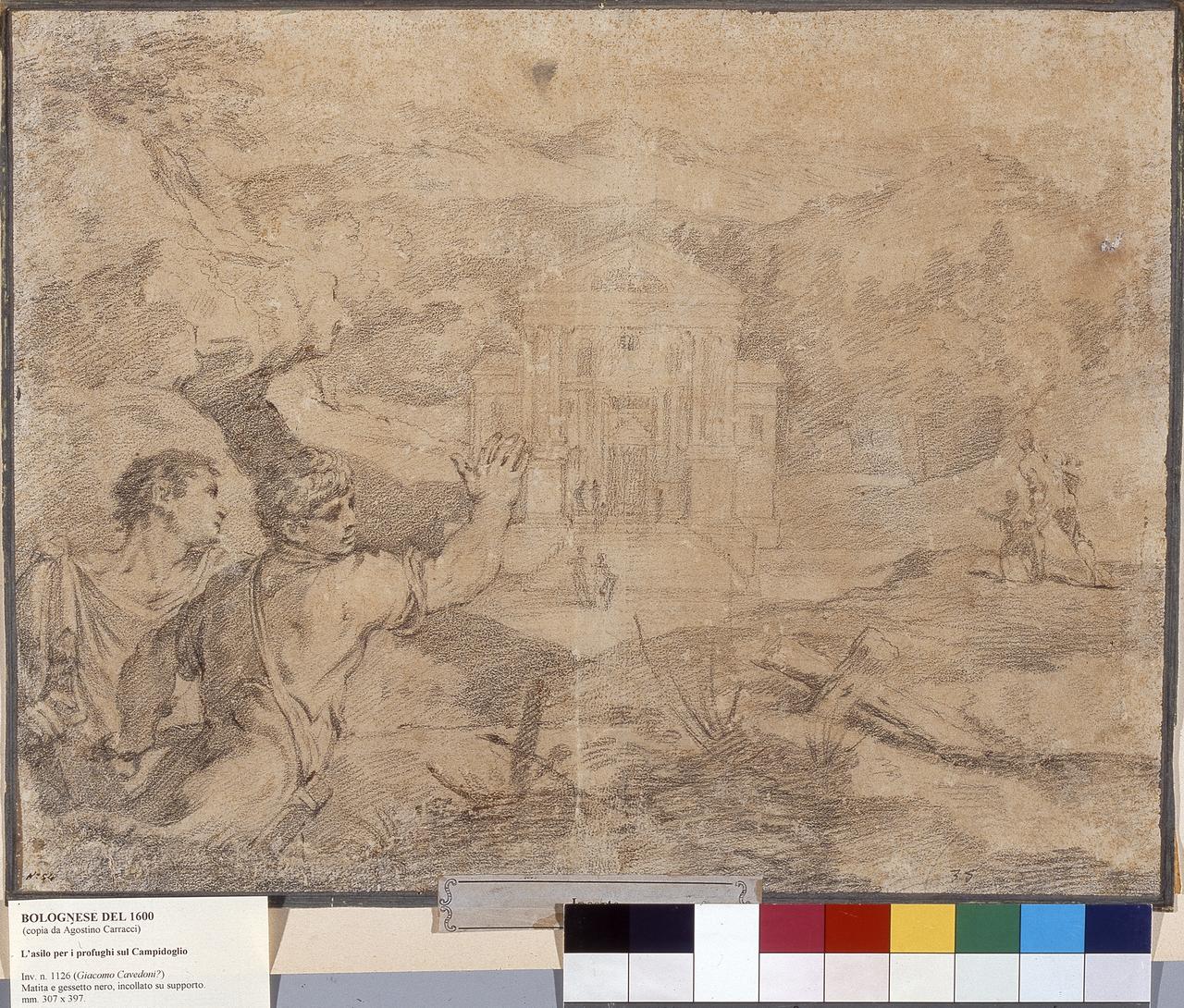 - NOTIZIE STORICO CRITICHE I disegni 1124, 1125, 1125 e 1127 sono copie dal fregio con le storie di Romolo e Remo di Palazzo Magnani a Bologna, affrescate da Annibale, Ludovico e Agostino Carracci. Classificati tra gli incerti, già da Castellani Tarabini (1854, p. 154, n. 148), la serie reca una proposta attributiva interessante a Giacomo Cavedoni, segnata da M. Tappi il 27 agosto 1956 sulla busta che contiene i fogli. La data della proposta è la stessa di un importante riordino dei disegni della Galleria Estense, e la proposta fu probabilmente avanzata nel corso dei lavori. Si tratta di una serie di fogli di buona qualità, di probabile ambito bolognese; la proposta a Cavedoni potrebbe essere un buon indirizzo di approfondimento. Sulla documentazione conservata presso l'ufficio catalogo della Soprintendenza di Modena, si preferisce determinare un ambito "bolognese del '600", che allo stato attuale degli studi è sottoscrivibile. Il foglio 1126 si riferisce a una scena del fregio di Palazzo Magnani affrescata da Agostino Carracci entro il 1592