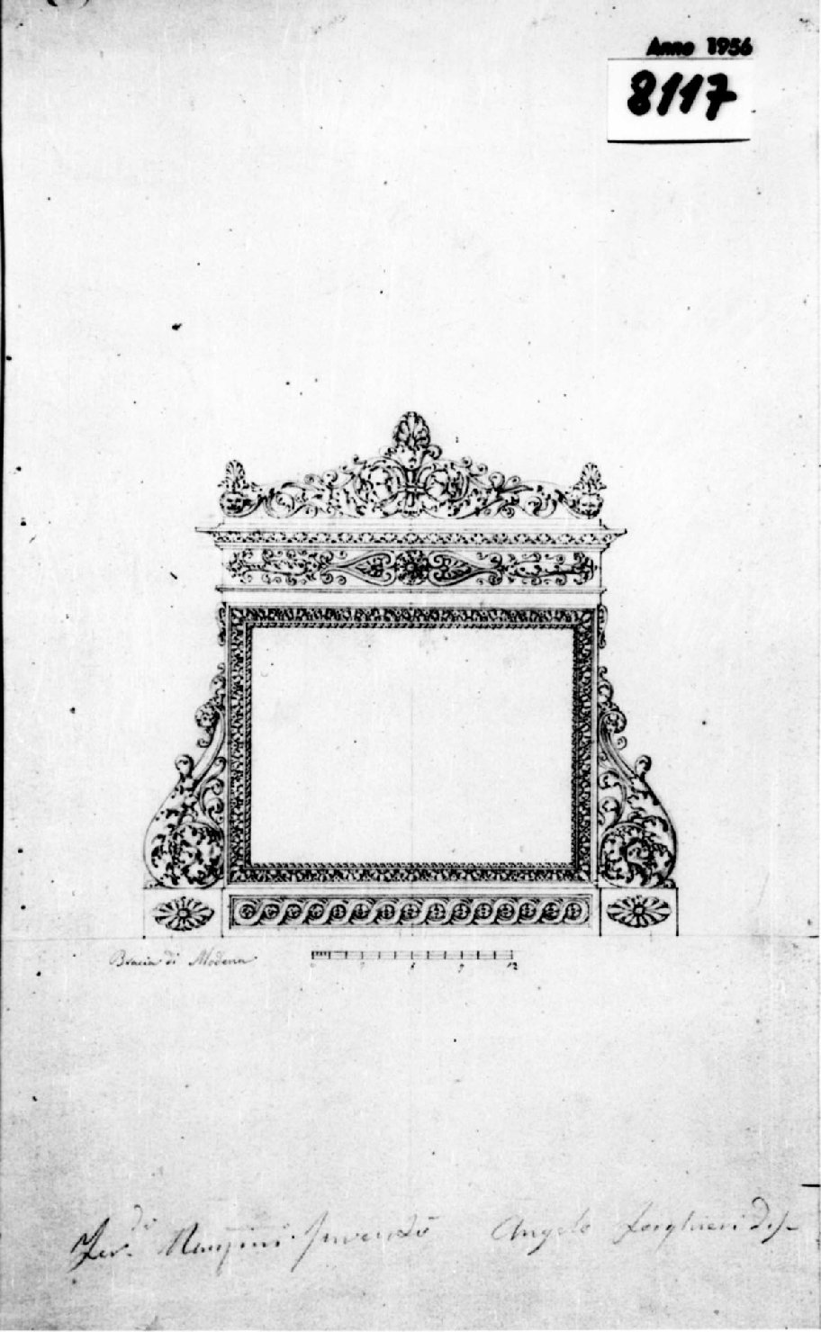- NOTIZIE STORICO CRITICHE Si tratta di un disegno di presentazione eseguito da Angelo Forghieri su ideazione di Ferdinando Manzini (Modena 1817-1886) per una specchiera che v enne realizzato da Giuseppe Tacconi ed esposta nel 1854 presso la Societ à di Incoraggiamento di Modena. Il disegno in esame venne inciso da G. Raf fo e pubblicato nell'Albo della Società (1854), dove si apprende che la "s pe cchiera intagliata ad ornati, del sign. Giuseppe Tacconi di Spilamberto " venne aggiudicata tramite sorteggio al Marchese Lodovico Coccapani Imperiali. Altri disegni simili a questo sono conservati in Galleria (inv. 8 116, 8118-8124). La composizione sul foglio è a matita nera su carta giallina