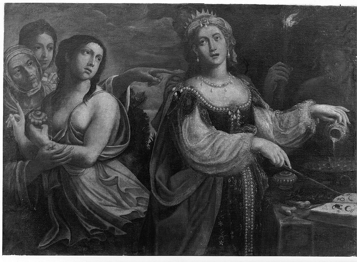 Leggermente spostata sulla destra rispetto al centro della composizione una maga (forse la maga di Endor) è impegnata a compiere quello che sembra un rito esoterico; dietro alla sua sinistra si scorge un essere umano dal volto mostruoso che brandisce una torcia. La parte sinistra del dipinto è occupata da tre donne: in primo piano una giovane che intimorita pare volersi allontanare dal cerimoniale ma viene trattenuta da un'anziana che le indica la maga; dietro l'anziana un'altra giovane di cui si vede solo il viso