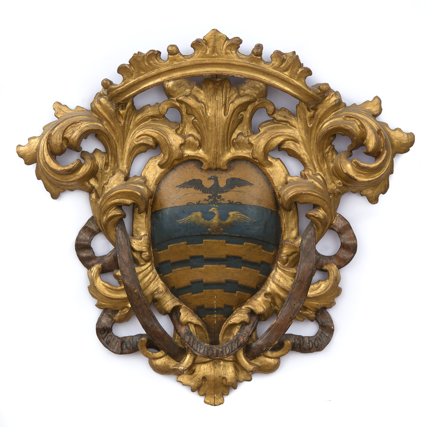 Stemma in legno intagliato a giorno. Coronato, contornato da foglie d'acanto arricciate e dorate, con un cartiglio nella parte inferiore riportante il nome del personaggio