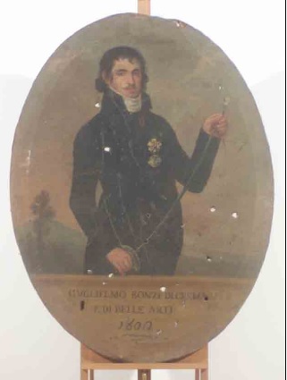 - NOTIZIE STORICO CRITICHE Guglielmo Bonzi nacque a Crema nel 1783 dal conte Giuseppe e dalla contessa Ignazia Guastaverza. Nel 1798 entrò come collegale insieme ai fratelli Ottimo e Leonardo (Leandro) al S. Carlo di Modena, fu registrato con il numero 1670. Guglielmo fu eletto principe di belle arti nel 1802. Anche questo dipinto, come altri ritratti appartenenti alle collezioni del collegio, fu schedato da Ragghianti una prima volta nel 1939 come possibile opera di Antonio Verni