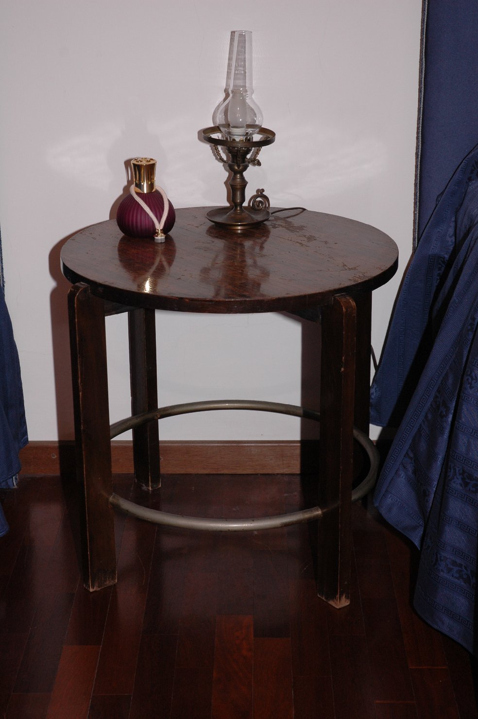 Tavolinetto a ripiano tondo, stile déco, traversa metallica curvilinea, piedi parallelepipedi