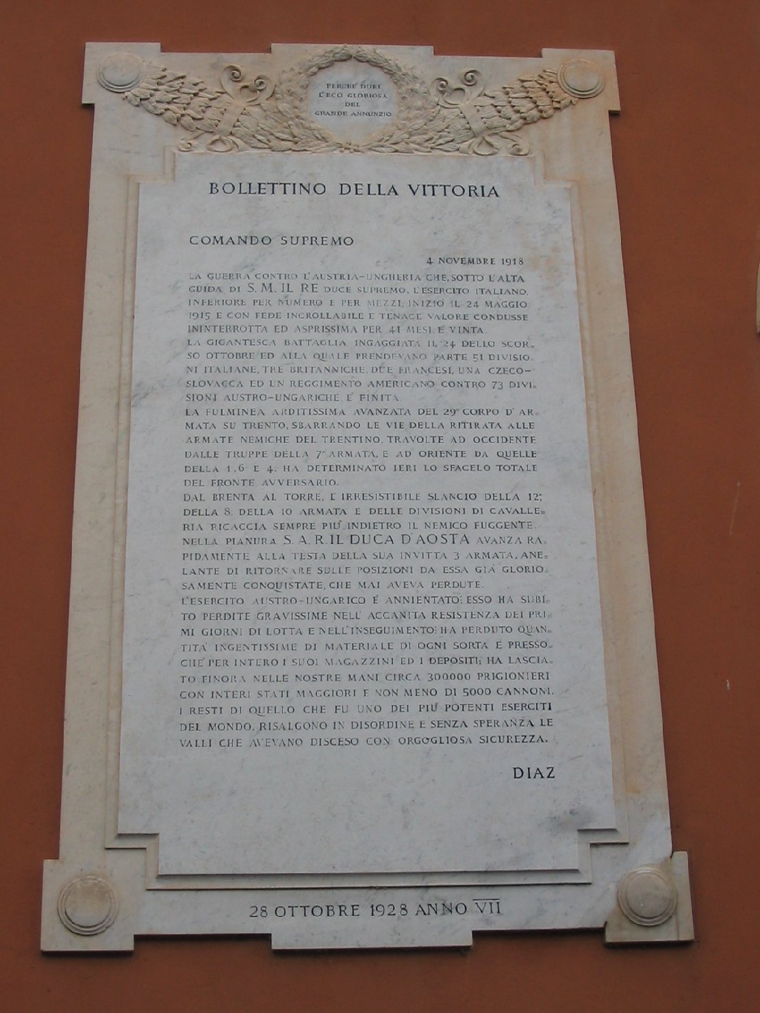Due lapidi in marmo bianco murate nella facciata principale del Municipio: a sinistra dello scalone esterno, è la lapide con i nomi dei soldati caduti; a destra, la seconda lapide riporta il Bollettino della Vittoria. I due manufatti mostrano la stessa decorazione a rilievo, semplice ed elegante, costituita da un festone legato ai due angoli superiori, pronunciati e decorati da cerchi concentrici, identici a quelli in basso. Al centro dell’ornamento vegetale è collocata una corona d’alloro, all’interno della quale è una frase in omaggio alle vittime. I nomi dei caduti e il testo del Bollettino della Vittoria sono incisi su lastre rettangolari, in marmo bianco e con gli angoli tagliati, che si sovrappongono alle lastre decorate