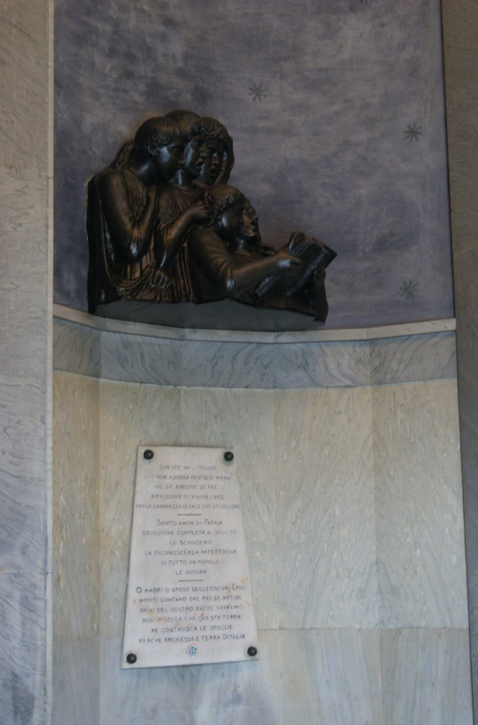 - NOTIZIE STORICO CRITICHE Si veda la scheda 0800577564 per le notizie storico critiche e la bibliografia. A sinistra dell’altare, sopra la lapide celebrativa, è stata collocata una riproduzione in bronzo ad altorilievo de I Cantori di Luca della Robbia. Il bronzo riprende, in altro materiale, il busto delle figure centrali di uno degli altorilievi che ornano la cantoria di Firenze. L’opera fu compiuta nel 1918 e fu destinata in un primo momento al monumento ai militari morti negli ospedali della città di Piacenza, monumento collocato proprio nel cimitero cittadino fin dal 1916
