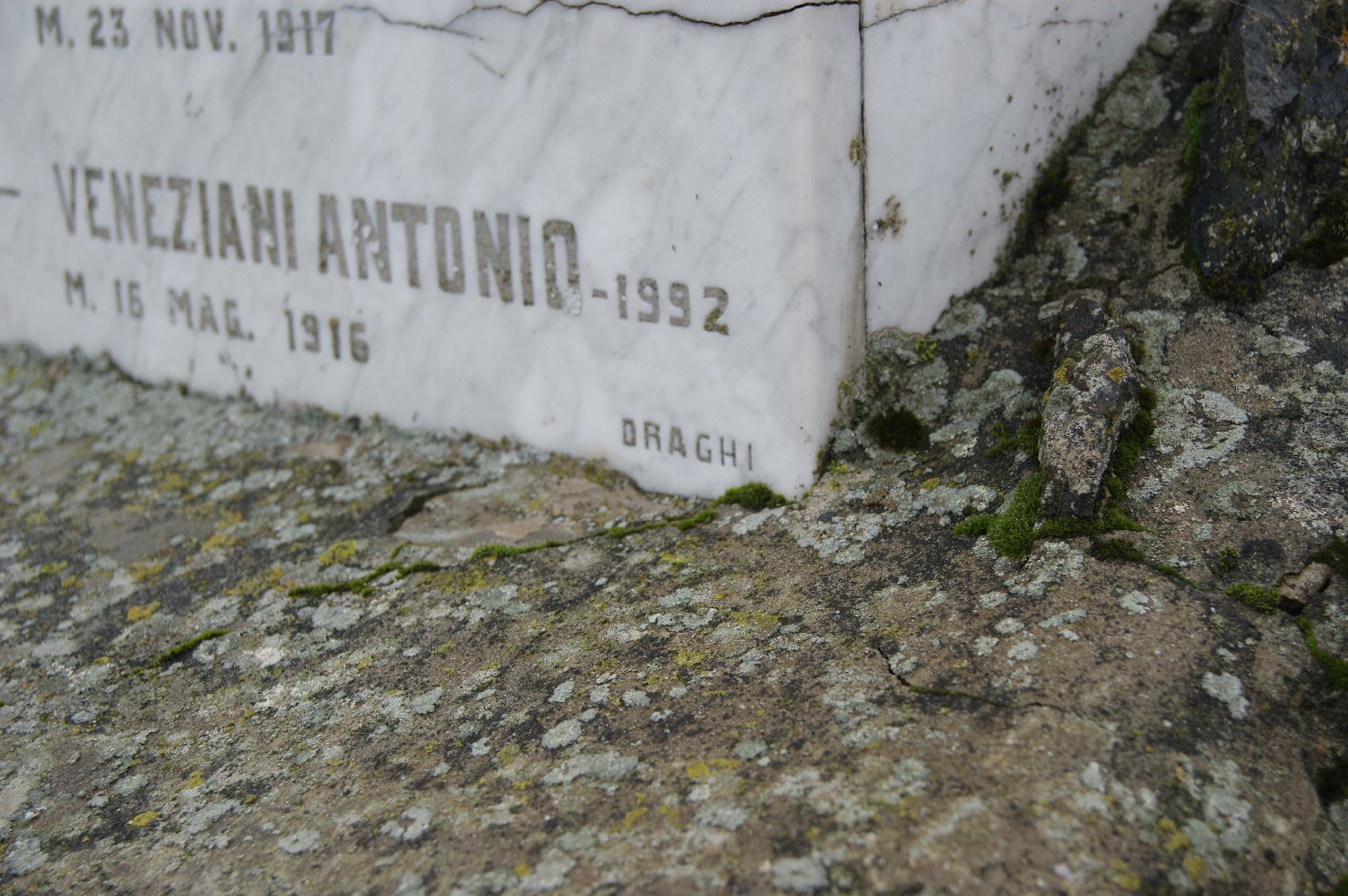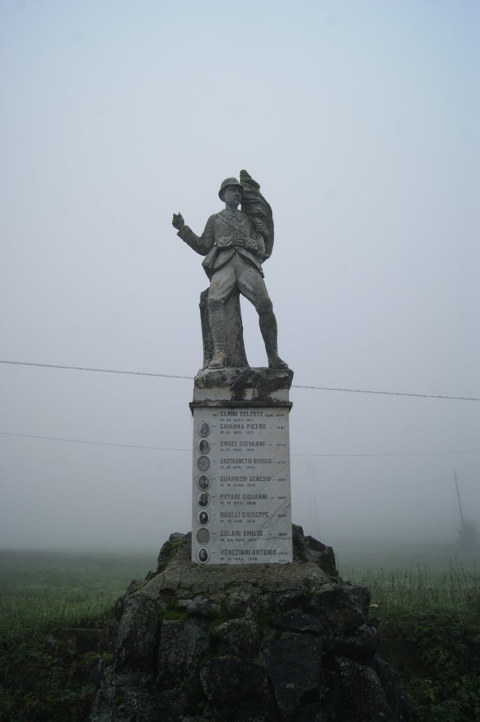 - ISCRIZIONI fronte, sul basamento - SOL(DATO) CARINI CELESTE CLAS(SE) 1878/ M. 29 SETT(EMBRE) 1917/ (SOLDATO) CAVANNA PIETRO (CLASSE) 1881/ M. 24 NOV(EMBRE) 1917/ (SOLDATO) CRUCI GIOVANNI (CLASSE) 1889/ M. 13 MAR(ZO) 1918/ (SOLDATO) CASTAGNETTI REMIGIO (CLASSE) 1888/ M. 29 APR(ILE) 1921/ (SOLDATO) GUARNIERI GENESIO (CLASSE) 1897/ M. 16 GENN(AIO) 1917/ (SOLDATO) PIFFANI GIOVANNI (CLASSE) 1897/ M. 17 OTT(OBRE) 1918/ (SOLDATO) RIGOLLI GIUSEPPE (CLASSE) 1893/ M. 19 LUG(LIO) 1915/ (SOLDATO) SOLARI EMILIO (CLASSE) 1886/ M. 23 NOV(EMBRE) 1917/ (SOLDATO) VENEZIANI ANTONIO 19(?)92/ M. 16 MAG(GIO) 1916/ DRAGHI - maiuscolo - a solchi - italiano