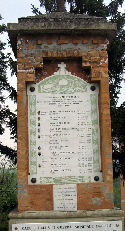 - ISCRIZIONI al centro - I CONCITTADINI DI MONTEBABBIO/ IN OMAGGIO ED A MEMORIA/ DI COLORO CHE COOPERARONO ALLA GRANDEZZA DELL’ITALIA/ E DIEDERO IL SANGUE PER LA PATRIA/ 1915-1918/ BEDESCHI FRANCESCO/ BEGHI PRIMO/ BORGHI MICHELE/ CAMURANI BARTOLOMEO/ GIAVELLI PIETRO/ MAIOLI ATTILIO/ NOTARI SILVIO/ PELATI PELLEGRINO/ PONTI AGOSTINO/ PRODI ANGELO/ TIMONI TIMOTEO - capitale -