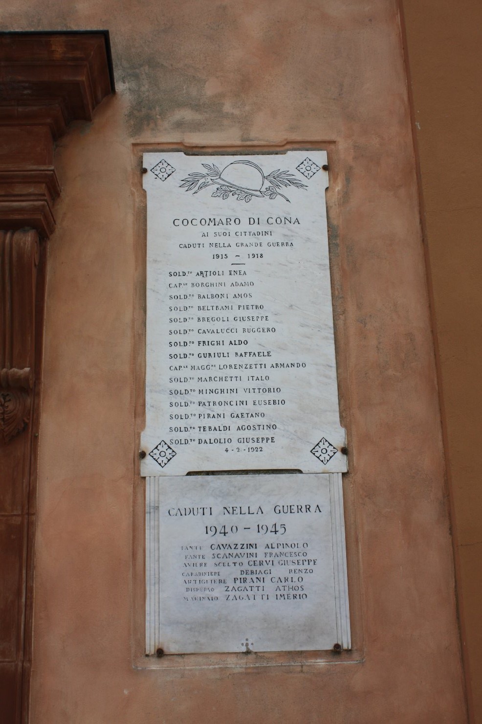 - ISCRIZIONI centrale - COCOMARO DI CONA/ AI SUOI CITADINI/ CADUTI NELLA GRANDE GUERRA/ 1915 - 1918/ -/ SOLD.TO ARTIOLI ENEA/ CAP.LE BORGHINI ADAMO/ SOLD.TO BALBONI AMOS/ SOLD.TO BELTRAMI PIETRO/ SOLD.TO BREGOLI GIUSEPPE/ SOLD.TO CAVALLUCCI RUGGERO/ SOLD.TO FRIGHI ALDO/ SOLD.TO GURIULI RAFFAELE/ CAP.LE MAGG.RE LORENZETTI ARMANDO/ SOLD.TO MARCHDETTI ITALO/ SOLD.TO MINGHINI VITTORIO/ SOLD.TO PATRONCINI EUSEBIO/ SOLD.TO PIRANI GAETANO/ SOLD.TO TEBALDI AGOSTINO/ SOLD.TO DALOLIO GIUSEPPE/ 4 - 2 - 1922 - capitale - a incisione - italiano