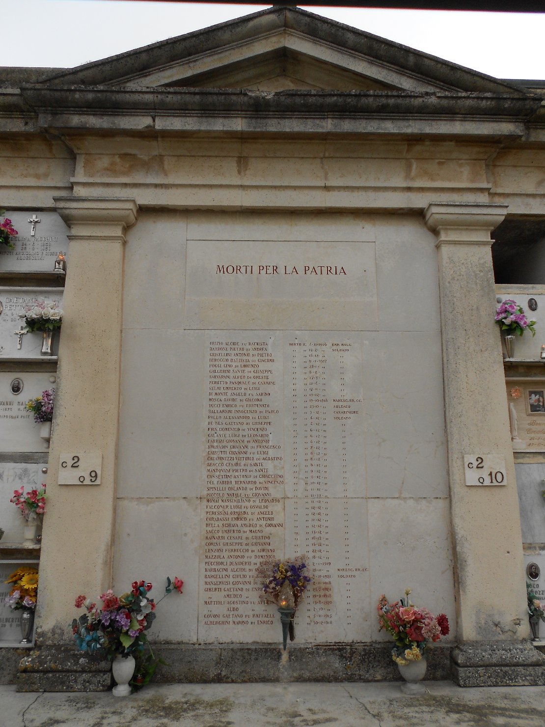 - ISCRIZIONI al centro - MORTI PER LA PATRIA/ ORIZIO ALCIDE FU BATTISTA MORTO IL 4.11.1916 CAP(ORAL) MAGG(IORE)/ MARRONE PIETRO DI ANDREA (MORTO IL) 19.2.(1916) SOLDATO/ GHISELLINI ANTONIO DI PIETRO (MORTO IL) 16.12.(1916) (SOLDATO)/ BEROGGIO BATTISTA DI GIACOMO (MORTO IL) 9.1.1917 (SOLDATO)/ POGGI GINO DI LORENZO (MORTO IL) 28.1.(1917) (SOLDATO)/ GALLORINI SANTE DI GIUSEPPE (MORTO IL) 8.2.(1917) (SOLDATO)/ SALVARANI ALFEO DI ORESTE (MORTO IL) 27.3.(1917) (SOLDATO)/ PEROTTO PASQUALE DI CARMINE (MORTO IL) 11.4.(1917) (SOLDATO)/ SELMI UMBERTO DI LUIGI (MORTO IL) 17.11.(1917) (SOLDATO)/ DI MONTE ANGELO FU SABINO (MORTO IL) 19.12.(1917) (SOLDATO)/ MOSCA DAVIDE DI GIACOMO (MORTO IL) 19.10.1918 MARESC(IALLO) RR. CC./ DUCCI ENRICO FU FORTUNATO (MORTO IL) 23.10.(1918) SOLDATO/ BALLARDINI INNOCENZO DI PAOLO (MORTO IL) 3.12.(1918) CARABINIERE/ POLLO ALESSANDRO DI LUIGI (MORTO IL) 4.12.(1918) SOLDATO/ DE NES GAETANO DI GIUSEPPE (MORTO IL) 4.12.(1918) (SOLDATO)/ FRIS DOMENICO DI VINCENZO (MORTO IL) 6.12.(1918) (SOLDATO)/ GALANTE LUIGI DI LEONARDO (MORTO IL) 6.12.(1918) (SOLDATO)/ FABRIZI GIOVANNI DI ANTONIO (MORTO IL) 6.12.(1918) (SOLDATO)/ BRUSADIN GIOVANNI DI FRANCESCO (MORTO IL) 7.12.(1918) (SOLDATO)/ CAISUTTI GIOVANNI FU LUIGI (MORTO IL) 8.12.(1918) (SOLDATO)/ CATARINUZZI VITTORIO DI AGOSTINO (MORTO IL) 8.12.(1918) (SOLDATO)/ BEACCO CESARE DI SANTE (MORTO IL) 8.12.(1918) (SOLDATO)/ MANTOVANI PIETRO DI SANTE (MORTO IL) 9.12.(1918) (SOLDATO)/ CASSETTINI ANTONIO DI GIOACCHINO (MORTO IL) 9.12.(1918) (SOLDATO)/ DEL FABBRO BERNARDO DI VINCENZO (MORTO IL) 10.12.(1918) (SOLDATO)/ SPINELLI ORLANDO DI DAVIDE (MORTO IL) 11.12.(1918) (SOLDATO)/ PICCOLO NATALE FU GIOVANNI (MORTO IL) 11.12.(1918) (SOLDATO)/ MONAI MASSIMILIANO DI LEONARDO (MORTO IL) 11.12.(1918) (SOLDATO)/ FALCONER LUIGI FU OSVALDO (MORTO IL) 12.12.(1918) (SOLDATO)/ PERESSINI ORMISDA DI ANGELO (MORTO IL) 12.12.(1918) (SOLDATO)/ CORADASSI ENRICO FU ANTONIO (MORTO IL) 11.12.(1918) (SOLDATO)/ DELLA SCHIAVA AMEDEO DI GIOVANNI (MORTO IL) 12.12.(1918) (SOLDATO)/ SACCO UMBERTO DI MAGNO (MORTO IL) 13.12.(1918) (SOLDATO)/ MAINARDI CESARE DI GIUSTINO (MORTO IL) 16.12.(1918) (SOLDATO)/ COMINA GIUSEPPE DI GIOVANNI (MORTO IL) 16.12.(1918) (SOLDATO)/ LENZONI FERRUCCIO DI ADRIANO/ MAZZOLA ANTONIO FU DOMENICO (MORTO IL) 18.12.(1918) (SOLDATO)/ PECCHIOLI DESIDERIO DI EGIDIO (MORTO IL) 2.1.1919 (SOLDATO)/ BARBACINI ALCIDE DI GUGLIELMO (MORTO IL) 26.11.(1919) MARESC(IALLO) RR. CC./ BARGELLINI GIULIO FU BIAGIO (MORTO IL) 8.10.1921 SOLDATO/ MANSERVISI GIOVANNI DI A[---] (MORTO IL) 2.11.1918 (SOLDATO)/ GIBERTI GAETANO DI ENRICO (MORTO IL) 28.7.1921 (SOLDATO)/ (GIBERTI) AMEDEO (DI ENRICO) (MORTO IL) 19.9.1918 (SOLDATO)/ MATTIOLI AGOSTINO FU ATTILIO (MORTO IL) 13.8.1920 (SOLDATO)/ (MATTIOLI) ALDO (FU ATTILIO) (MORTO IL) 2.10.(1920) (SOLDATO)/ GOVONI GAETANO FU RAFFAELE (MORTO IL) 5.11.1915 (SOLDATO)/ ALBERGHINI MARINO DI ENRICO (MORTO IL) 30.12.1918 (SOLDATO) - capitale - a solchi -