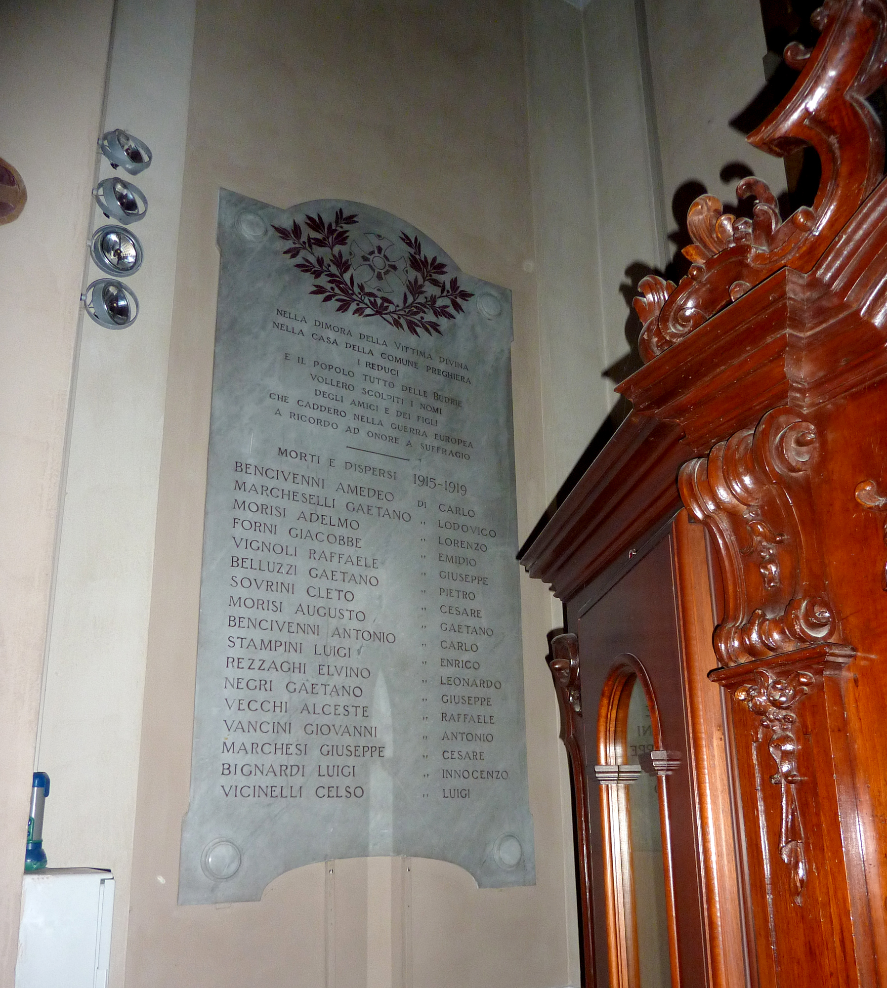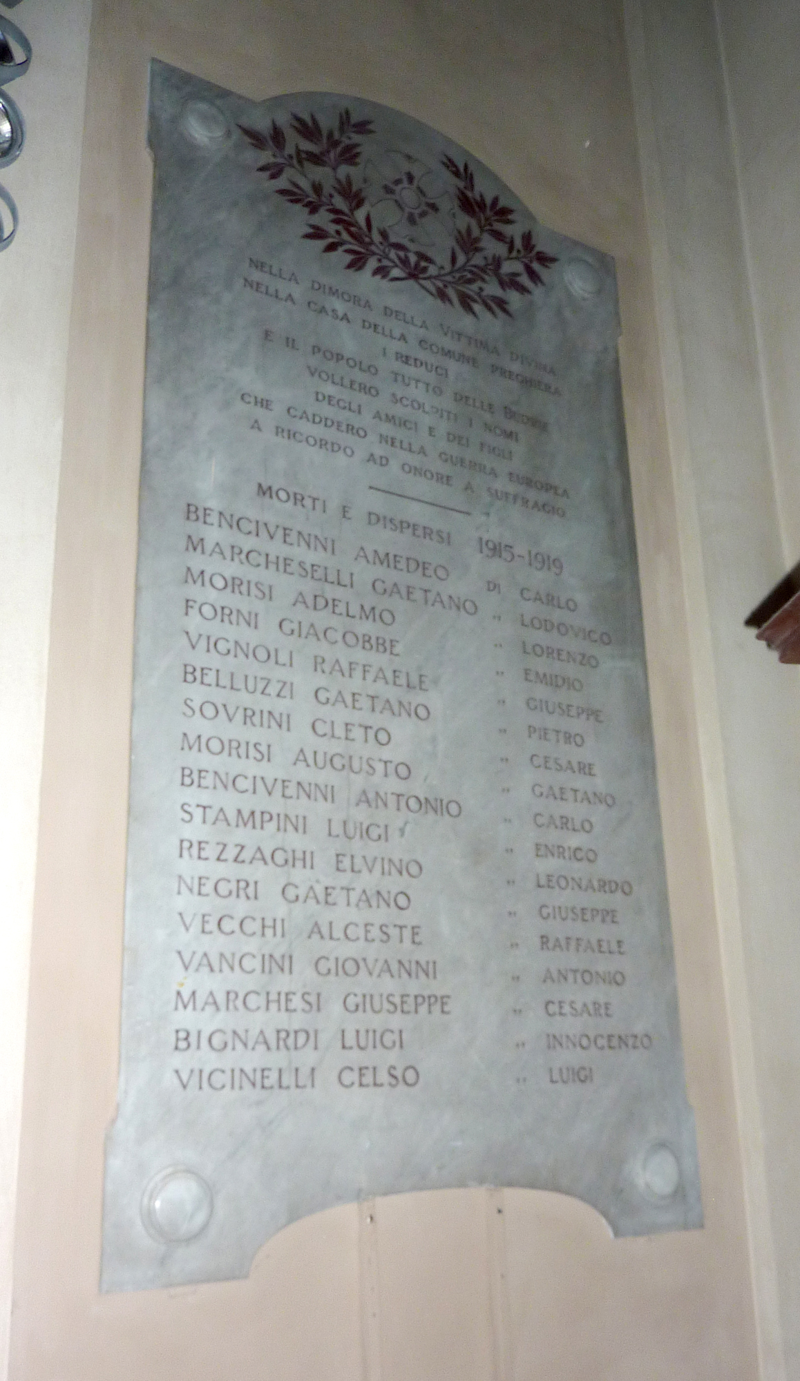 - ISCRIZIONI sulla lapide, a tutto campo - NELLA DIMORA DELLA VITTIMA DIVINA/ NELLA CASA DELLA COMUNE PREGHIERA/ I REDUCI/ E IL POPOLO TUTTO DELLE BUDRIE/ VOLLERO SCOLPITI I NOMI/ DEGLI AMICI E DEI FIGLI/ CHE CADDERO NELLA GUERRA EUROPEA/ A RICORDO AD ONORE A SUFFRAGIO/ MORTI E DISPERSI 1915-1919/ BENCIVENNI AMEDEO DI CARLO/ MARCHESELLI GAETANO “ CARLO/ MORISI ADELMO “ LORENZO/ FORNI GIACOBBE “ EMIDIO/ VIGNOLI RAFFAELE “ GIUSEPPE/ BELLUZZI GAETANO “ PIETRO/ SOVRINI CLETO “ CESARE/ MORISI AUGUSTO “ GAETANO/ BENCIVENNI ANTONIO “ CARLO/ STAMPINI LUIGI “ ENRICO/ REZZAGHI ELVINO “ LEONARDO/ NEGRI GAETANO “ GIUSEPPE/ VECCHI ALCESTE “ RAFFAELE/ VANCINI GIOVANNI “ ANTONIO/ MARCHESI GIUSEPPE “ CESARE/ BIGNARDI LUIGI “ INNOCENZO/ VICINELLI CELSO “ LUIGI - capitale -