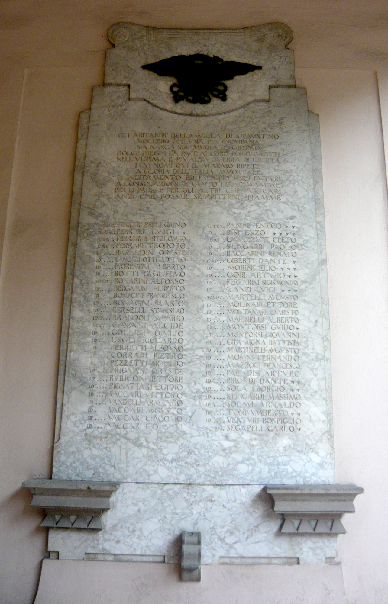 - ISCRIZIONI sulla lapide, a tutto campo - GLI ABITANTI DELLA VILLA DI S. FAVSTINO/ VOLLERO CHE VNA PIA CAMPANA/ SIA NASCA SIA MVOIA IL GIORNO/ DOLCE PREGHI LA PACE/ AI LORO FORTI CADVUTI/ NELL’VLTIMA E PIV’ ALTA GVERRA DI LIBERTA’/ I CVI NOMI QVI IL MARMO RIPETE/ A GLORIA DELL’ITALIA IMMORTALE/ A INCITAMENTO ED ESEMPIO PER I FVTVRI/ A CONSOLAZIONE E VANTO PER LE MAMME/ PER LI PADRI E PER GLI ALTRI CHE FVR CARI/ ANZI CHE FOSSER SEMPITERNE FIAMME/ MAGG. FERRARI PELLEGRINO/ MAGG. FERRARI LUIGI/ TEN. FERRARI BARTOLOMEO/ CAP.LE FERRARI TEODORO/ ID … BARALDI RESTE/ ID … LANCELLOTTI ADELMO/ ID … FIORENTINI ALBERTO/ ID … BOTTI GUGLIELMO/ SOLD. BONARINI ALFONSO/ ID … BERGAMINI ALBERTO/ ID … BONACINI FRANCESCO/ ID … BONACINI MARIO/ ID … BERSELLI STANISLAO/ ID … BRANDOLI MARIO/ ID … CAVANI ALCIDE/ ID … GOLLINI GIVLIO/ ID … LVGLI RICCARDO/ ID … FERRETTI ALFONSO/ ID … CORRADI PIETRO/ ID … PEZZETTI ARMANDO/ ID … FRIGNANI ORESTE/ ID … RVBICONE ETTORE/ ID … PIGNATTARI EGIDIO/ ID … VACCARI VITTORIO/ ID … VANDELLI ARMANDO/ ID … VACCARI AVGVSTO/ ID … VACCARI GIACOMO/ ID … VACCARI GIOVANNI/ S. TEN. PANINI ENRICO/ ID … BISI ENZO/ SERG. CAVAZZVTI CLETO/ ID … SILINGARDI PAOLO/ ID … BACCARINI RENATO/ CAP.LE GIBERTI DANTE/ ID … MORINI ELIO/ ID … GORI ARTVRO/ ID … FERRARINI SIGISMONDO/ ID … ZANFI LVIGI/ SOLD. MARTELLI AVGVSTO/ ID … MOLINARI ETTORE/ ID … MONTANARI EVARISTO/ ID … MONTORSI GVIDO/ ID … MONTORSI GIOVANNI/ ID … GRAMIGNA BATTISTA/ ID … MARTINELLI AVGVSTO/ ID … MORINI FERNANDO/ ID …MAZZOLI FRANCESCO/ ID … PARADISI ARTVRO/ ID … PIRONDI DANTE/ SOLA GIORGIO/ ID … SILINGARDI MASSIMO/ ID … SOLMI ARNALDO/ ID … TONI VMBERTO/ ID … VENTVRI BONFIGLIO/ S. TEN. SEGAPELI CARLO/ XV . VI . MCMXXIV - capitale -