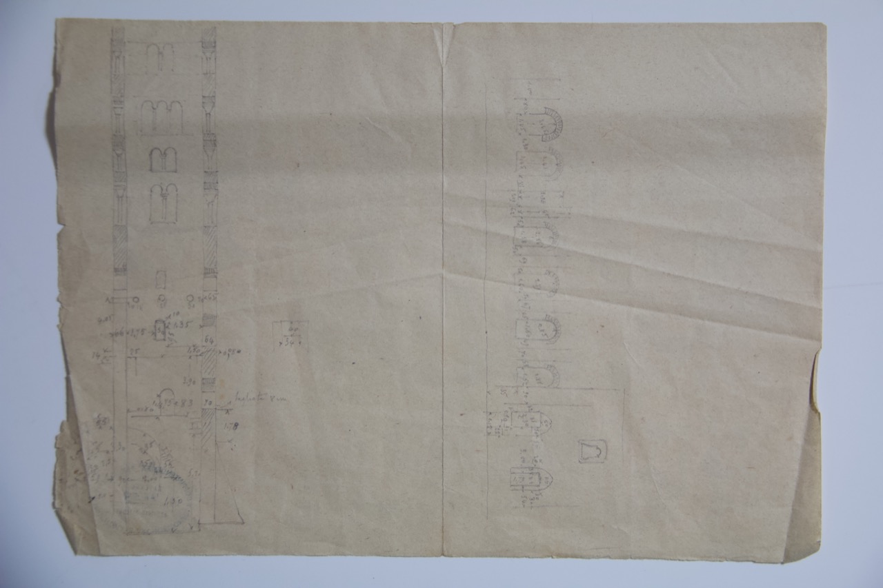 Disegno a matita su carta liscia. Rilievo in alzato del muro esterno, navata sinistra e rilievo in sezione verticale del campanile della basilica di San Giovanni Evangelista di Ravenna. Sul verso, rilievi in alzato e in pianta del campanile