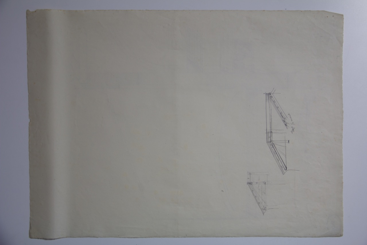 Disegno a matita su carta leggera. Sezione della navata destra con la sistemazione barocca della basilica di San Giovanni Evangelista di Ravenna. Scala 1:20. Sul verso, capriata in legno della zona absidale