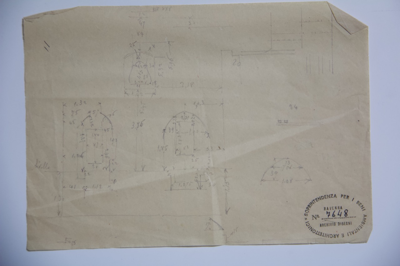 Disegno a matita su carta liscia. Rilievo in alzato delle finestre della cappella gotica di sinistra, con la soprastante finestrella barocca della basilica di San Giovanni Evangelista di Ravenna