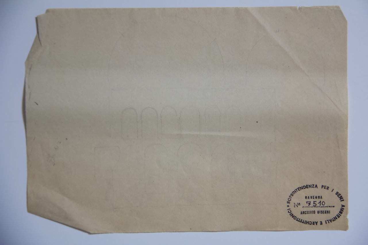 Disegno a matita su carta liscia. Rilievo delle arcate contenenti le finestre della basilica di San Giovanni Evangelista di Ravenna. Appunti sul retro