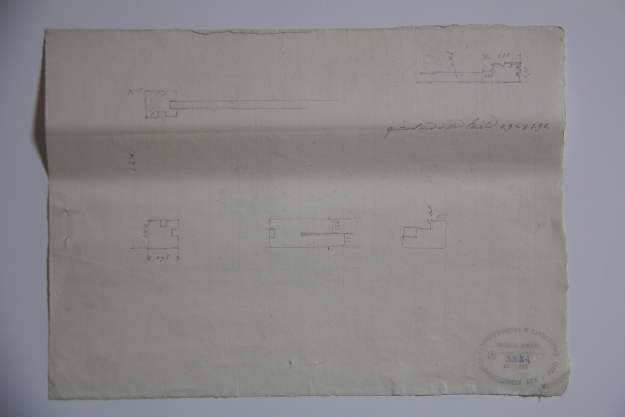 Disegno a matita su carta a righe. Rilievo di alzato di ciborio, incompleto, della basilica di San Giovanni Evangelista di Ravenna, sul verso rilievo in pianta di ciborio