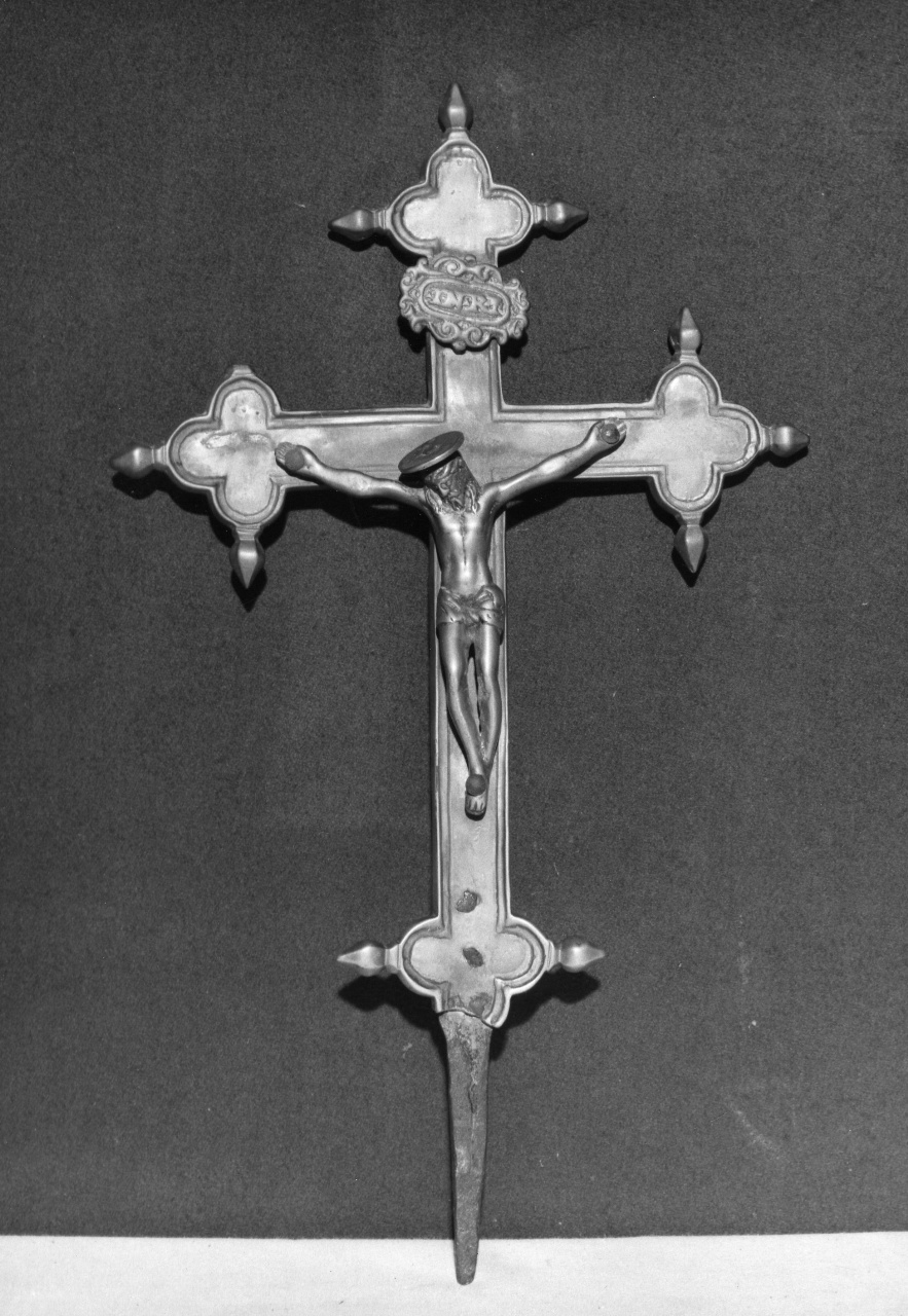 La croce, profilata lungo il margine esterno, trilobata alle quattro estremità, decorate con puntali, è in ottone come il crocifisso, con aureola, perizoma e capelli incisi