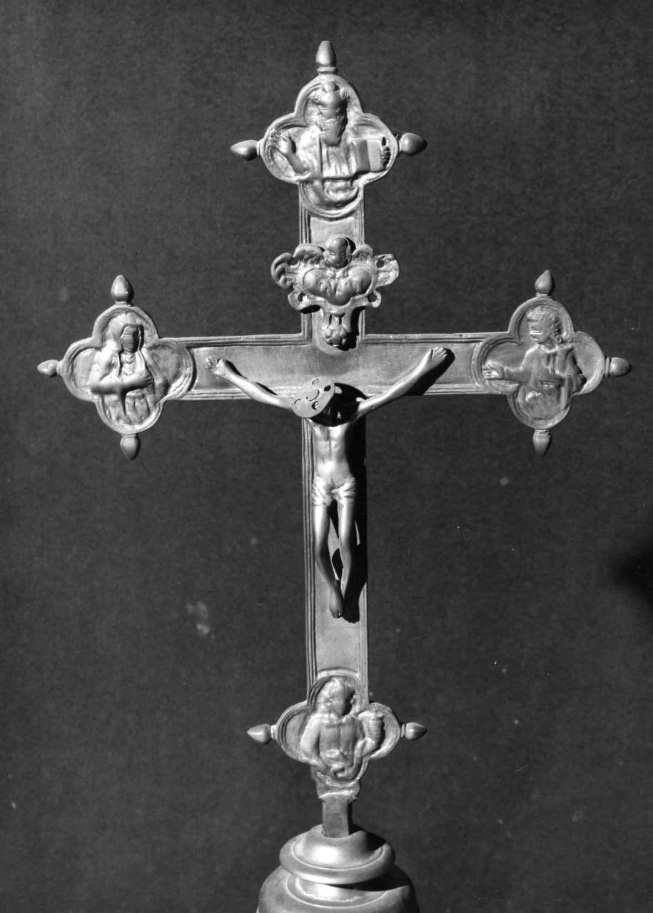 Alle quattro estremità della croce sono, entro formelle quadrilobate terminanti con puntali, le mezze figure a rilievo del Padre Eterno, della Vergine, dell'Evangelista Giovanni e di Santa Maria Maddalena. Il Cristo reca un'aureola circolare in metallo, posteriore
