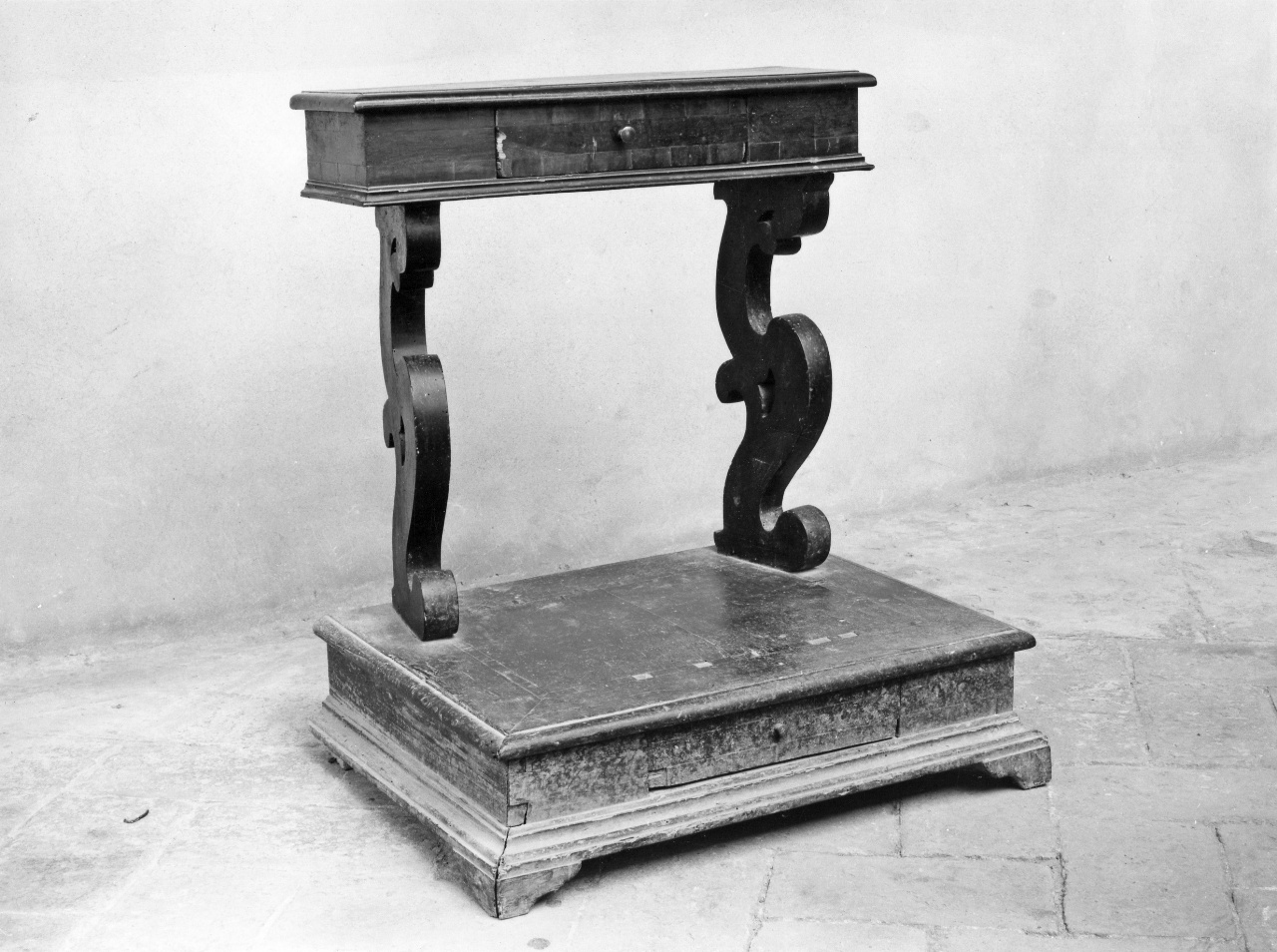L'oggetto presenta una forma composta di due piani semplicemente rettangolari con cornici modanate, collegati da sostegni a voluta contrapposta