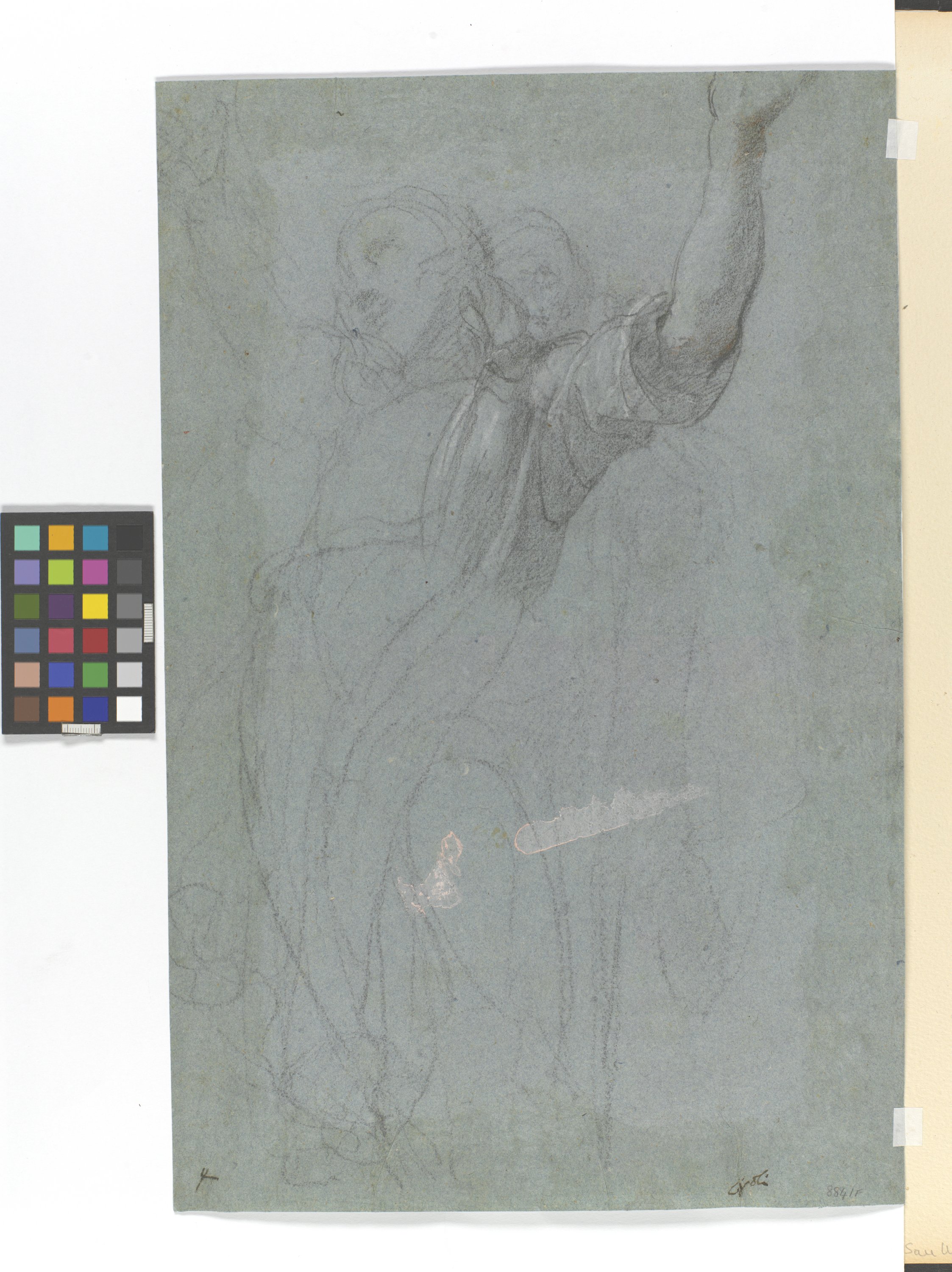 recto: San Paolo visto da sotto in su, con la spada nella destra e con il braccio sinistro sollevato. verso: figura maschile vista fino a tre quarti da sotto in su, con il braccio sinistro sollevato; al centro leggero schizzo di testa