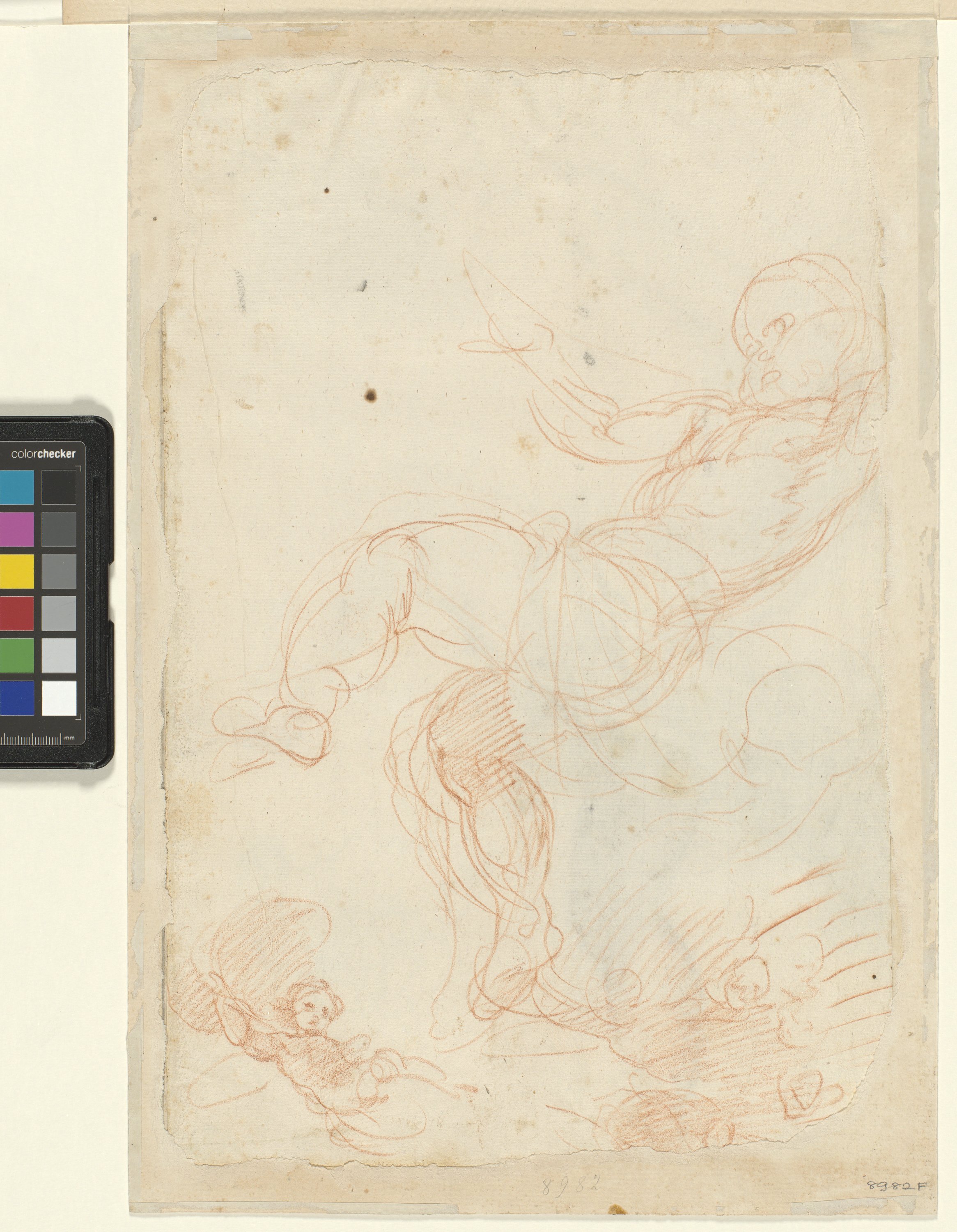 recto: manigoldo in piedi visto di spalle, volto a destra, con la gamba e il braccio sinistro sollevati in alto. in alto e in basso altri due schizzi di figure. verso: un angelo in volo posto traversalmente al foglio; quasi di profilo a sinistra, e in basso altri schizzi di putti volanti