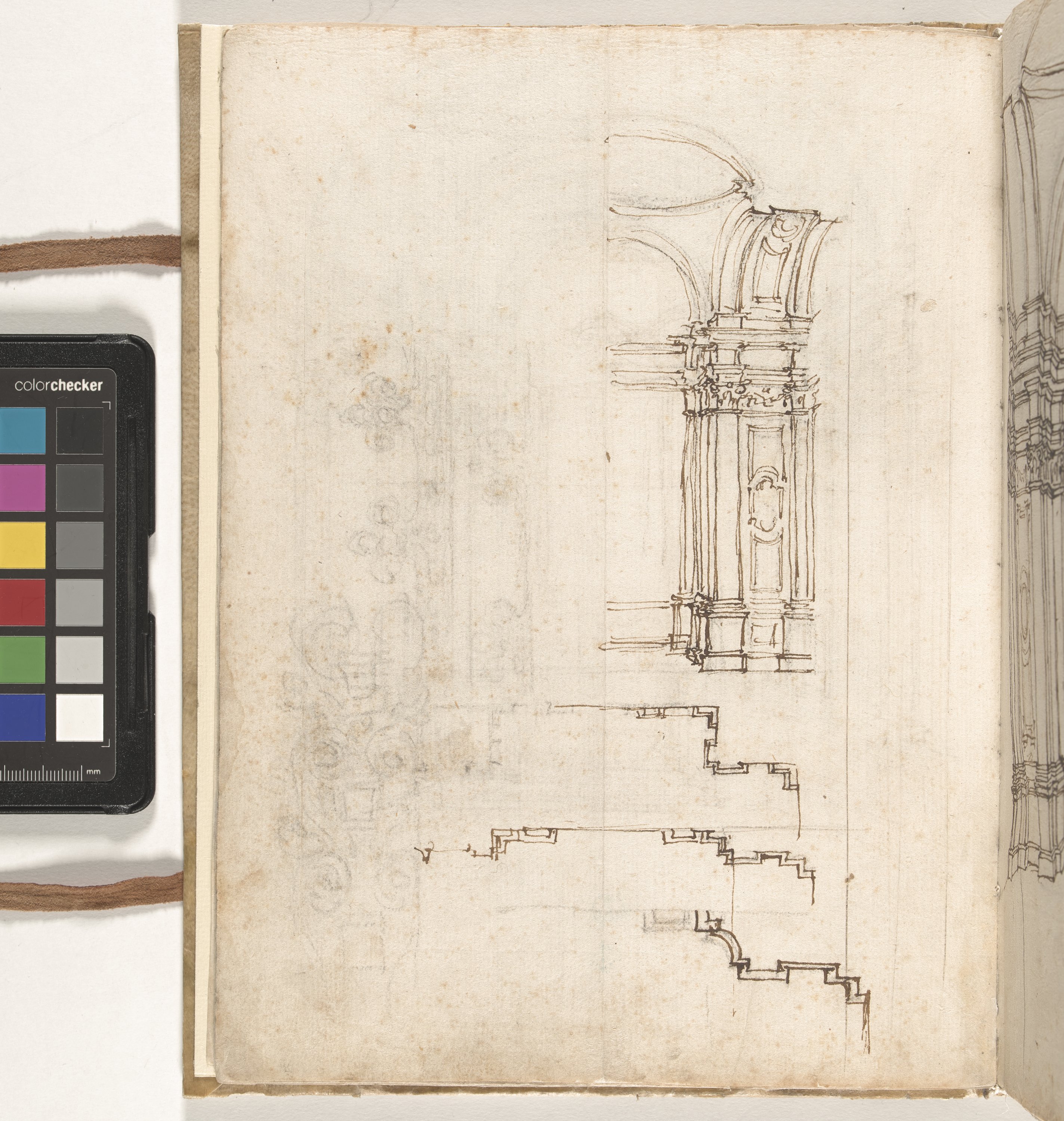 recto: Interno di cappella con volta a botte, pareti decorate da paraste con capitello, altare con gradini e tavola con cornice architettonica ornata da volute. verso: Spaccato destro d'interno con cupola e arcone. Tre accenni di pianta dello stesso e motivi decorativi