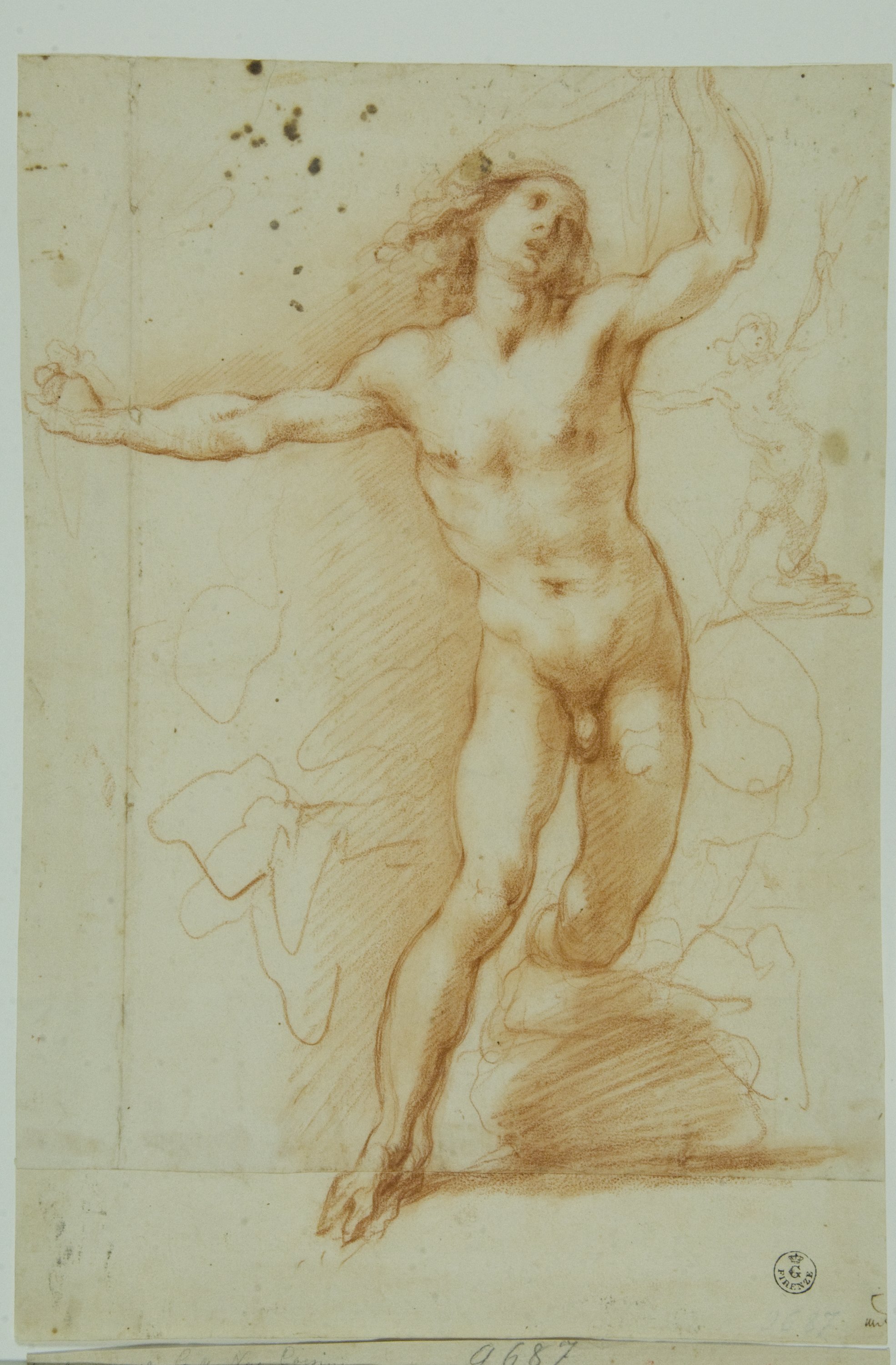 Figura maschile nuda in piedi con le braccia sollevate; schizzo della stessa figura (disegno) di Furini Francesco (XVII)