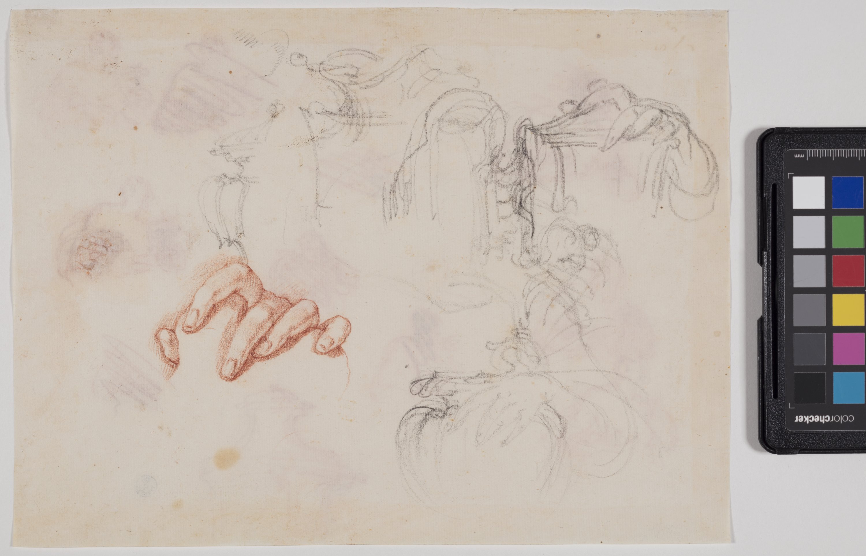 recto: Il disegno rappresenta undici piccoli studi di nudo femminile a mezzo busto con in mano, in un primo tempo, una coppa e poi un'urna di cui vi è anche l' abbozzo nella parte bassa a destra del foglio. verso: Vari studi di una urna con la mano appoggiata e poi, quasi al centro del foglio, uno studio più dettagliato di detta mano