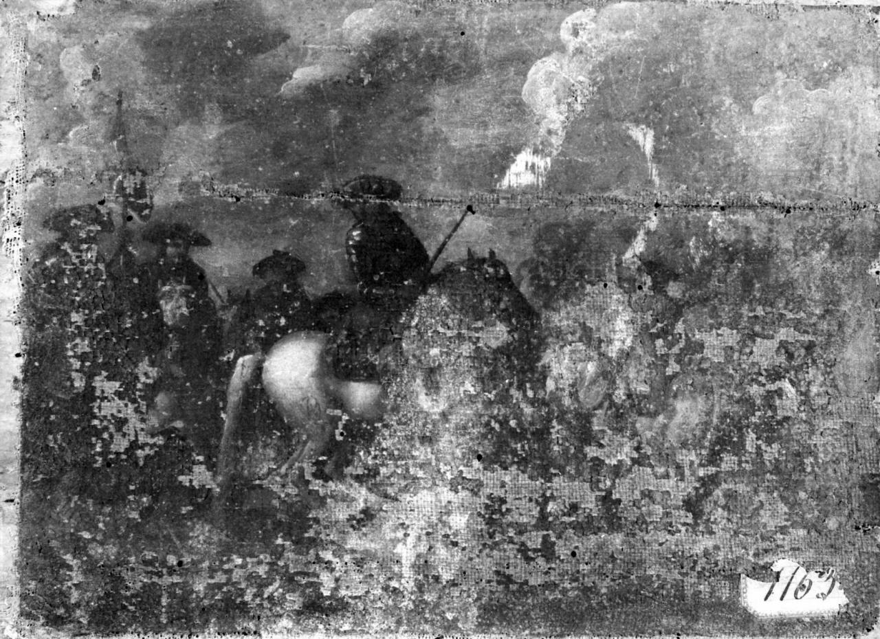 - NOTIZIE STORICO CRITICHE Inventariato (1881 e 1890) come maniera del Borgognone, il quadro risultagià "deperito" nel 1881. Le ampie cadute di colore hanno risparmiato parte del cavallo e del cavaliere raffigurati al centro. Proprio sul posteriore del cavallo è visibile il monogramma G.P. modo particolare di firmare di Giuseppe Pinacci. La stessa sigla, posta sempre sulle natiche del cavallo, compare in altre due opere conosciute del Pinacci e cioè nello "Scontro di cavalleria" (inv. Petraia n. 189) e nelle "truppe a cavallo e a piedi" (Prato, Galleria di Palazzo degli Alberti)