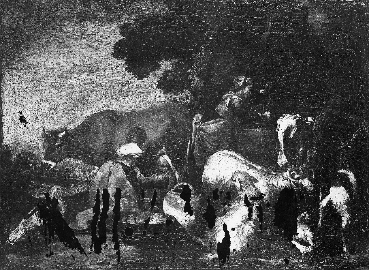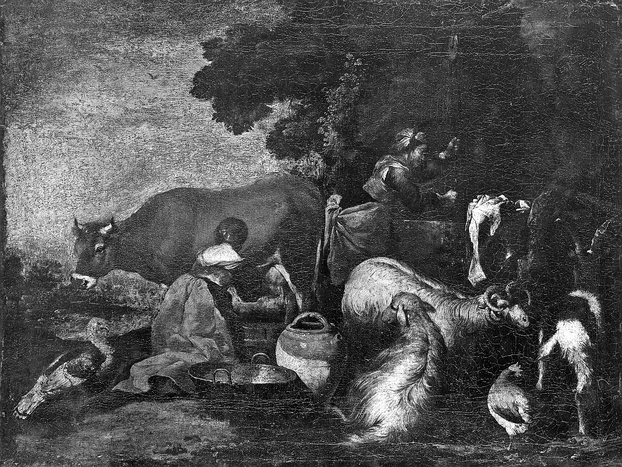 - NOTIZIE STORICO CRITICHE Sullo sfondo di un paesaggio una donna di schiena intenta a mungere una vacca, un'altra donna in piedi di profilo attinge da un pozzo; in primo piano capre, animali da cortile e orci, catinelle di rame e di terracotta. Attribuito al Castiglione negli inventari ottocenteschi degli Uffizi dove era esposto sino al 1940 circa, è stato restituito al Vassallo dal Grosso e accolto come tale dalla Meloni, che propose di identificarlo con uno dei 'due quadri con figure e animali' dati come opere del Castiglione in una filza d'archivio che documenta la provenienza di entrambi dalla raccolta di Carlo Del Sera. L'altro è il n. 1412. (cfr. Archivio Uffizi, X, 54). Il dipinto è stato esposto alla mostra 'Dipinti del Seicento genovese', Firenze, Galleria degli Uffizi, 1964, n. 7)