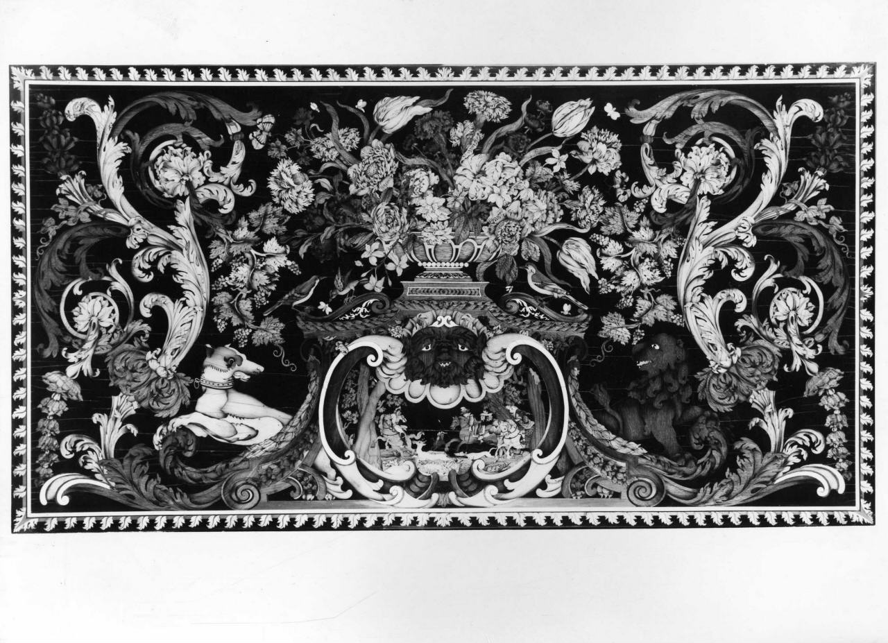 Tavolo con gambe a piramide in legno di pero, tinte di nero, fascia e piano riccamente intarsiati di legni vari e madreperla; i motivi ornamentali sono costituiti da trionfi di fiori, tra cui spiccano tulipani e garofani, tralci vegetali, animali (leone e cane) e, al centro, scena di caccia