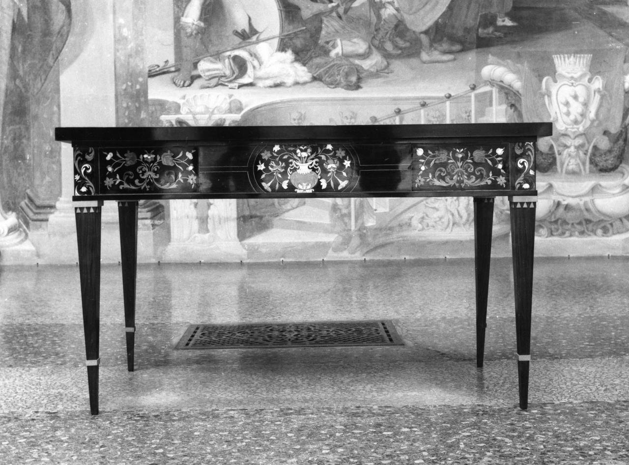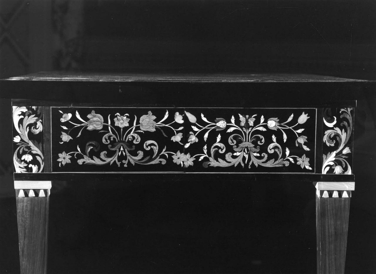 - NOTIZIE STORICO CRITICHE Questo tavolo con il suo pendant 0900035848 é reperibile negli inventari della Villa di Castello dal 1799 al 1861. Nell'inventario del 1812 risultano collocati nelle stanze 11 e 56; in quello del 1802 e del 1799, nella stanza 36. Sono splendidi prodotti di stile Luigi XVI riccamente ornati ad intarsio secondo il gusto e la tecnica introdotta nelle botteghe granducali dall'ebanista olandese Leonardo van de Vinne, nella seconda metà del secolo XVIII