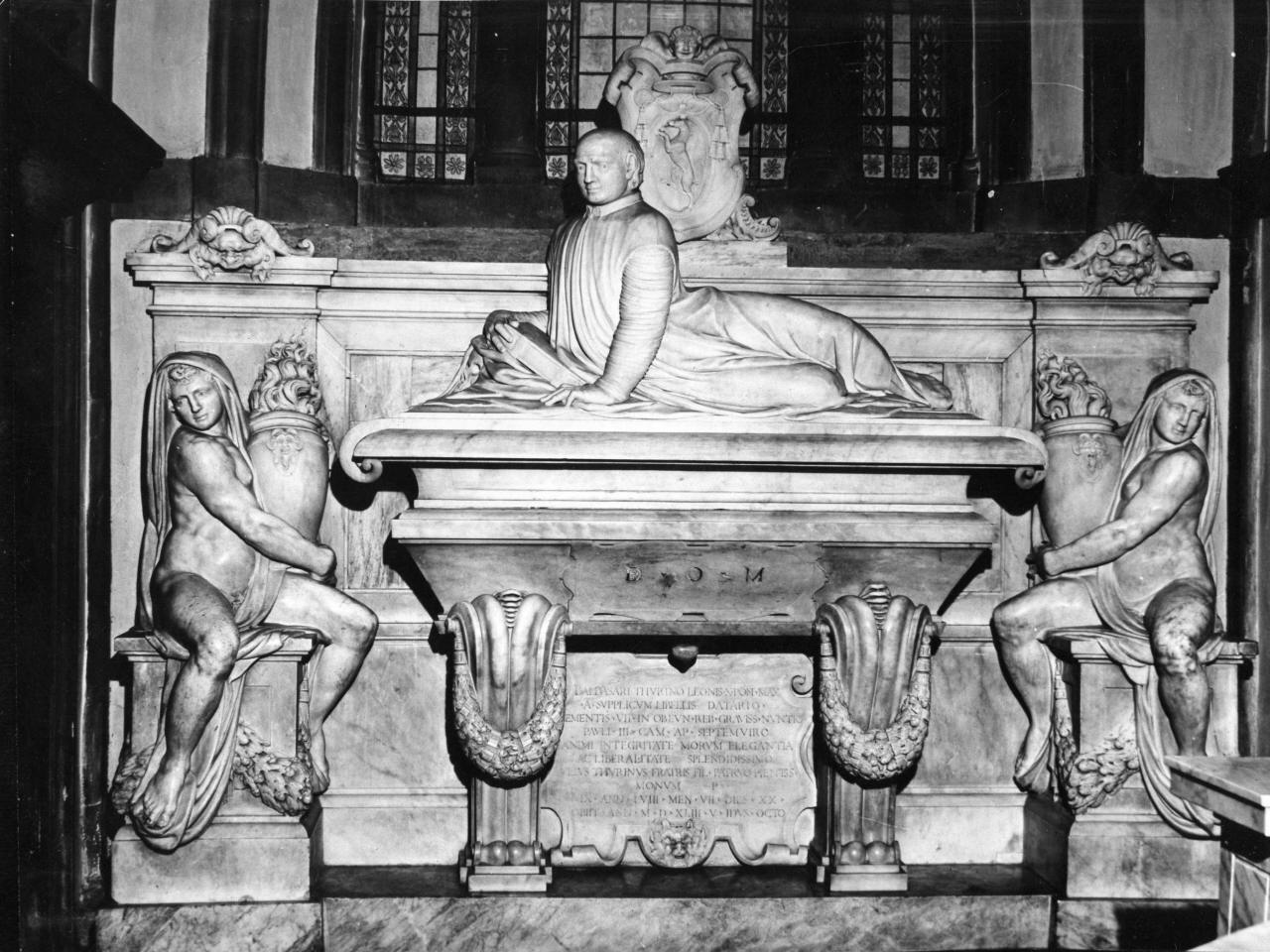 Sarcofago impostato su basamento e poggiante su mensole a volute con ghirlande. AI lati, seduti su basamento, geni con vaso fiammeggiante. Al centro del dossale, dietro la figura, stemma vescovile