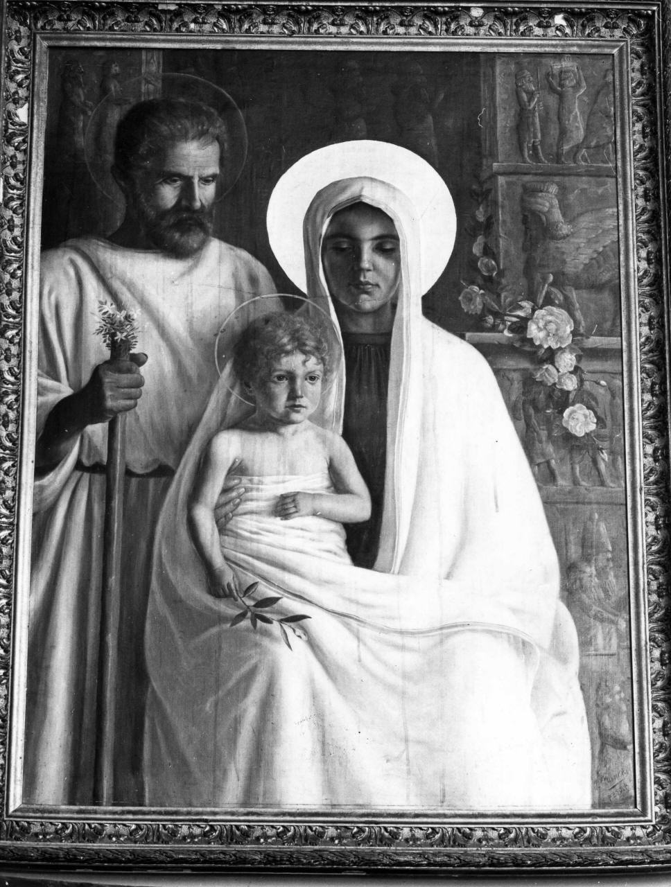 Soggetti sacri. Personaggi: Madonna; Gesù Bambino; San Giuseppe. Abbigliamento: all'antica. Architetture: pilastri; rilievi