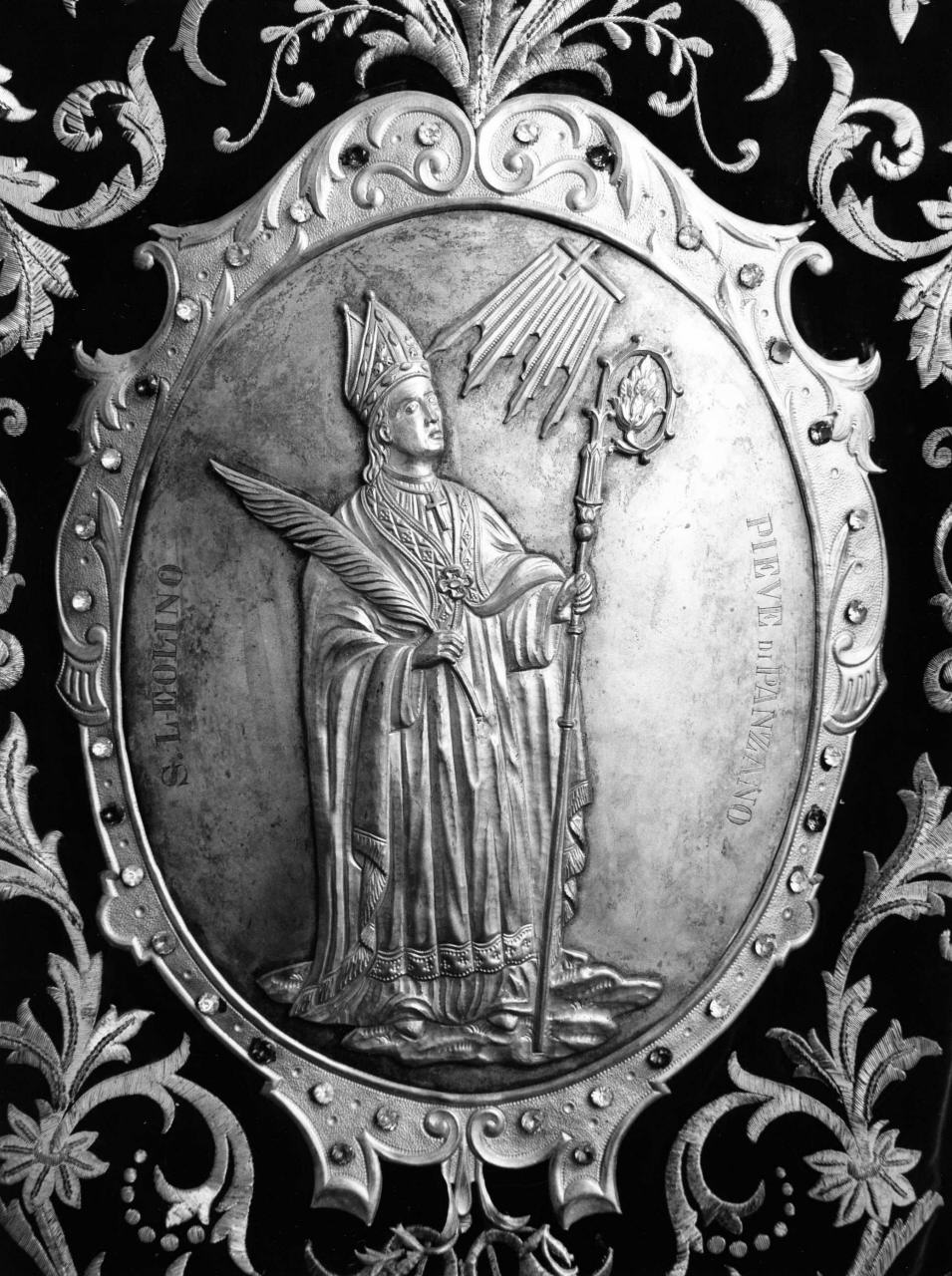 - NOTIZIE STORICO CRITICHE Manufatto tessile con ricca decorazione floreale di fine secolo. Le figure sbalzate in metallo, ben eseguite, rappresentano i due santi protettori del luogo, secondo l'iconografia tradizionale
