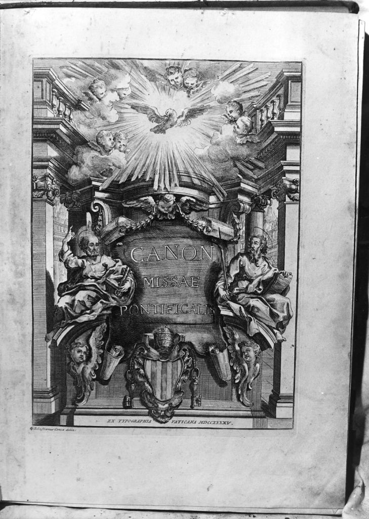 La legatura in pelle è decoratacon una doppia filettatura in oro che chiude un bordo nero; al centro del piatto è impressa una croce. Contiene un libro a stampa del canone della messa pontificale. Nel frontespizio è raffigurata un'edicola con loSpirito Santo tra angeli; sotto gli apostoli Pietro e Paolo e lo stemma pontificio. Seguono le iscrizioni: " Canon Missae pontificalis"; in basso a sinistra: "Sebastianus Conca delin."; in basso al centro: "Ex Typographia vaticana MDCCXXXXV"
