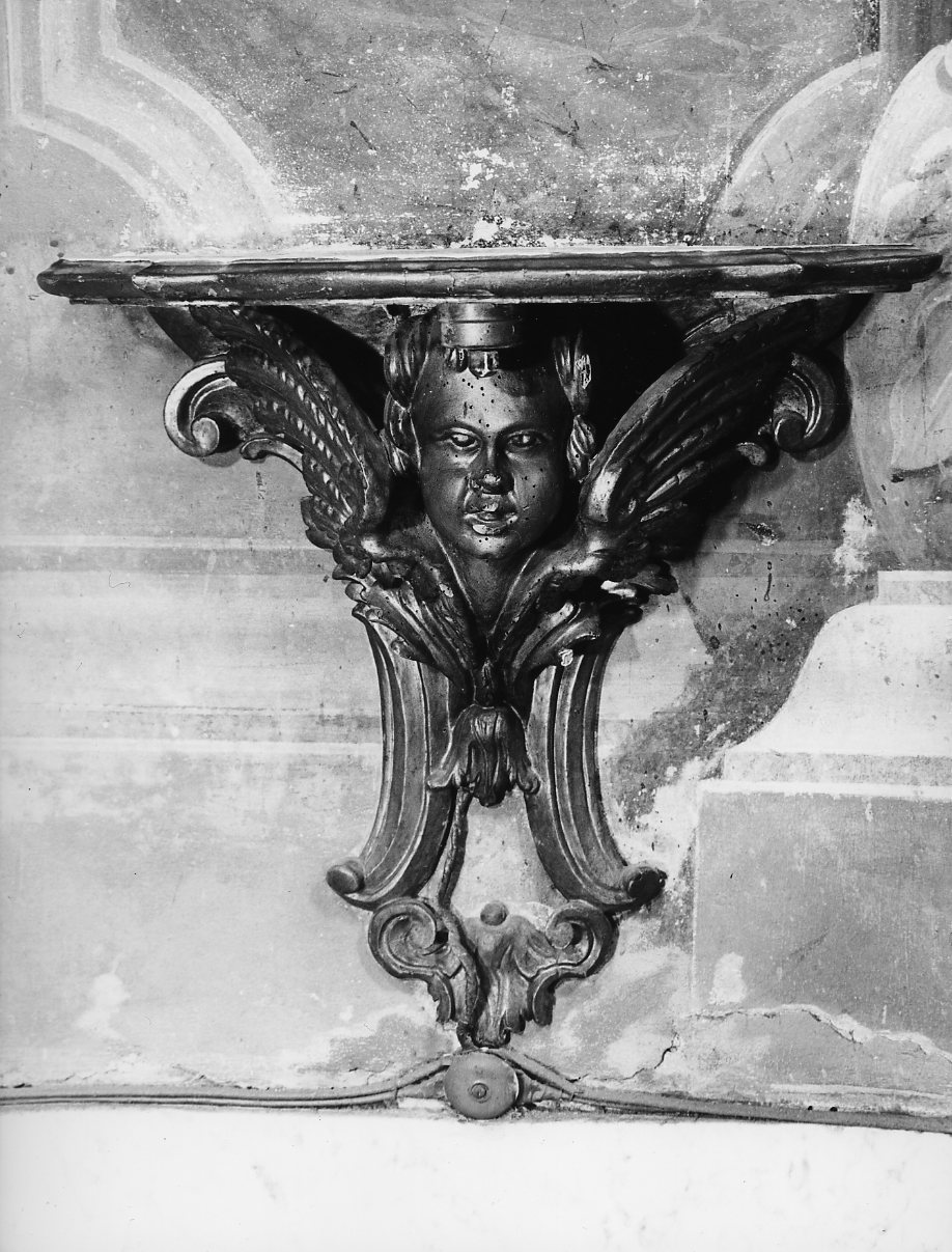 Il piano sagomato a cornice poggia su cariatidi raffiguranti, in una mezzo busto di donna, nell'altra una testa di cherubino. Le figurazioni sono al centro di due volute arricciate verso l'esterno. In basso motivi di foglia e di cartella. Una delle mensole conserva il piano e la piccola alzata di ottone