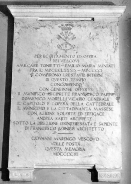 - NOTIZIE STORICO CRITICHE G. PIOMBANTI, "La Certosa di Pisa", 1884, p. 131, la descrive ma non fa mensione dell'autore; A. MANGHI, "La Certosa di Pisa", 1911, p. 124, riferisce che nel 1701, il Pr. Fedeli commissionava le porte a destra e sinistra dell'ingresso a Giuseppe di Agostino Bambi da Settignano, su disegno del frate Iacopo Antonioli, scritturale alla Certosa. Il lavoro veniva eseguito nel 1702 e nel 1703 era compiuto anche il tramezzo per il quale "Le Memorie" suggeriscono il nome dello stesso Bambi. La parete divisoria separa il coro vestibolare dei conversi da quello dei monaci e combacia col dorso degli stalli di questo; è impostato all'altezza della fine della prima campata, due pilastri della quale furono parzialmente tagliati in quella occasione.Il fregio in rilievo di ogni parte del tramezzo, raffigura i simboli riuniti delle Certose di Gorgona e Calci legati dalla corona della casa Gambacorti