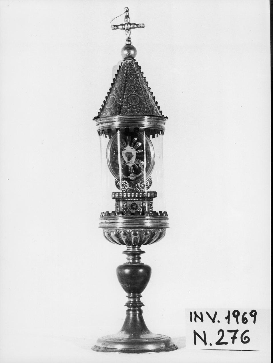 Il reliquiario è costituito da una base circolare con nodo piriforme su cui poggia un cilindro di cristallo sormontato da una cupola a cuspide. Il sottocoppa è decorato a baccellature. La cuspide, divisa in sei settori da cordonature, è incisa con motivi a squame. All'interno della teca vi è un ovale con reliquia poggiante su un cubo rivestito e guarnito di cartacolorata. Il globo e la croce al vertice sono aggiunte posteriori