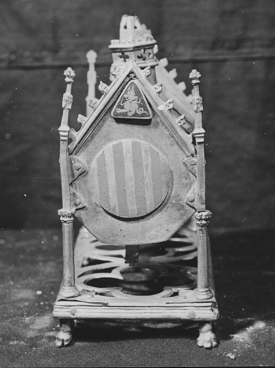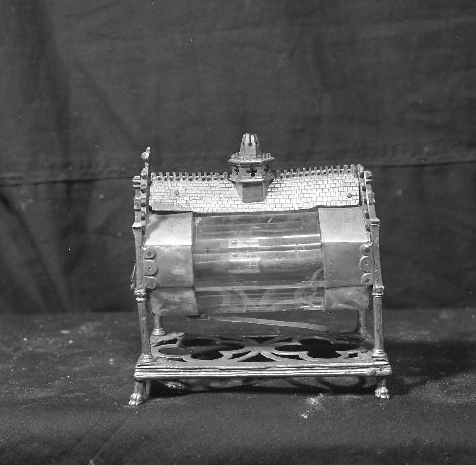 Due reliquiari in rame dorato a forma di arca. La base, poggia su zampe leonine è un rettangolo traforato a quadrilobi iscritti in due cerchi. Ai quattro angoli, colonnine corinzie sostengono un prisma ottagonale di cristallo in posizione orizzontale incapsulato alle estremità. Nelle facce esterne, del prisma due sportelli rotondi con cerniera, uno reca inciso una croce e flagelli, l'altro smaltato a strisce verticali rosse e oro, all'interno dei quali, uno contiene un osso con fascetta in argento e scrittura incisa forse trecentesca, sui lati corti reca una placchetta dorata con croce sul calvario e una scritta, nell'altro un osso di S. Basilio presbite e martire su un lato una scritta in lettere latine e dorate, sull'altro ad inchiostro e lettere greche. La parte superiore delle basi è a cuspide, generata dalla copertura a due spioventi con pinnacoli ed entro la quale è un triangolo a rilievo con drago su sfondo di smalto blu. Il tetto con le tegole incise è contornato da pinnacoli e torretta centrale esagona con finestre quadrilobe, merli e e cuspide tronca