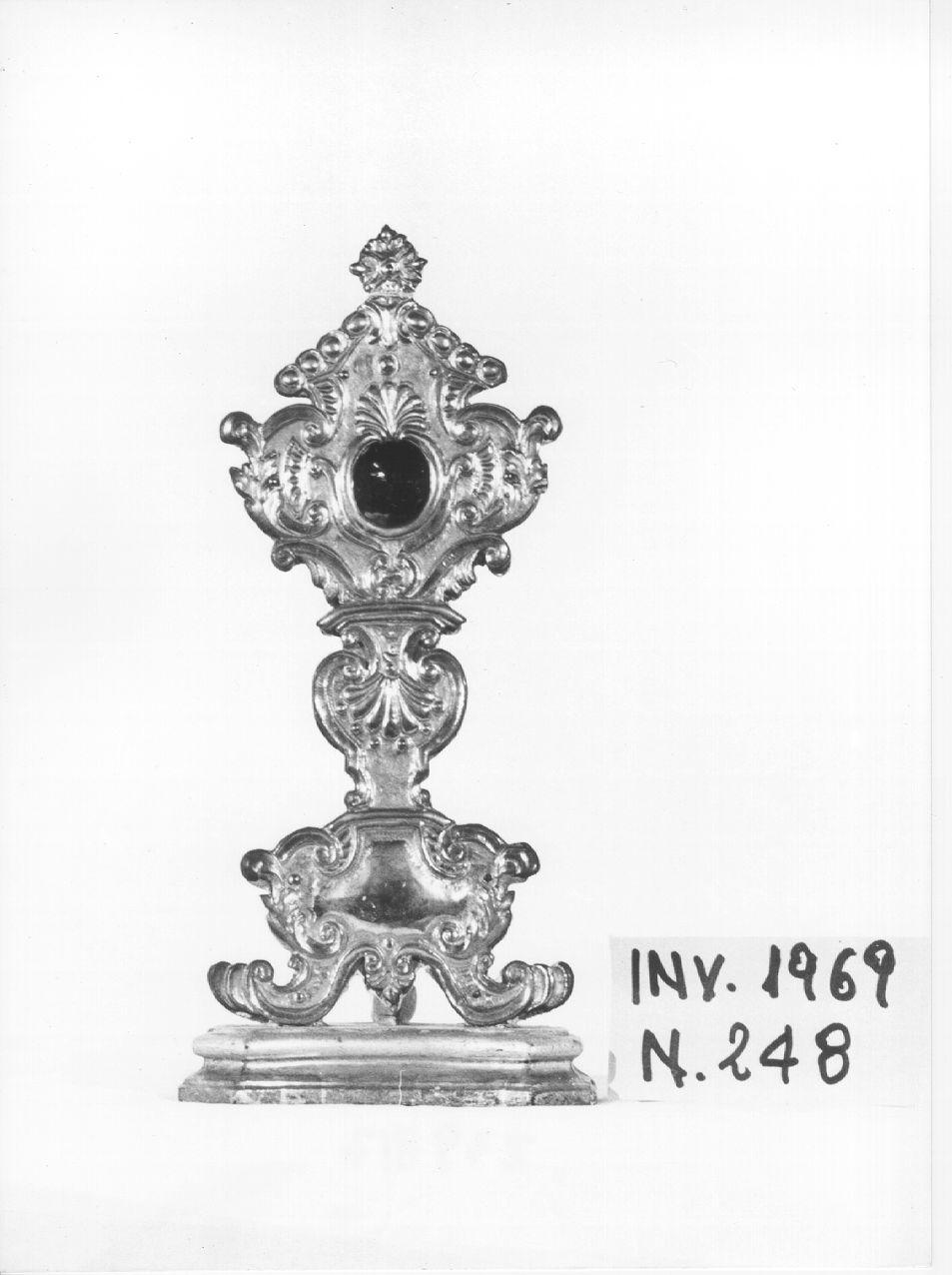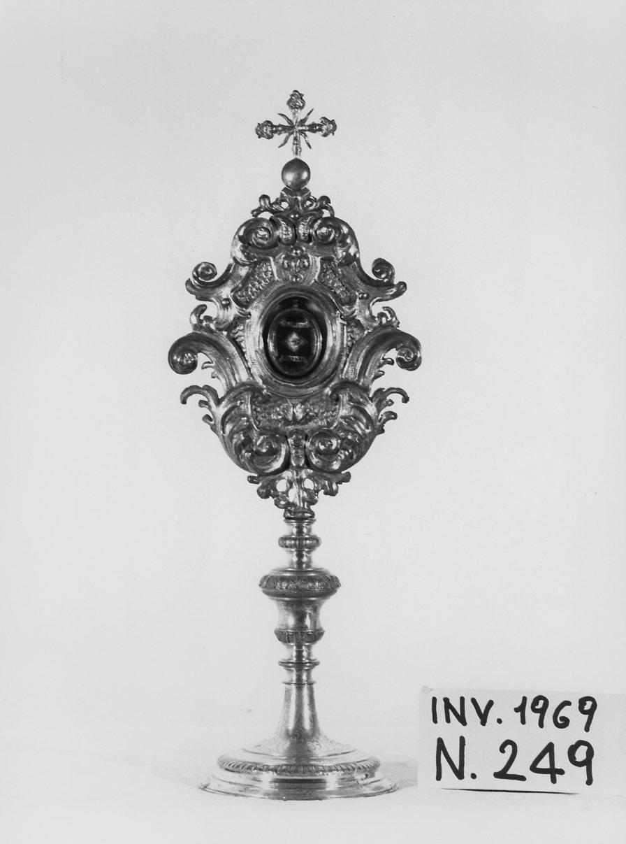 Reliquiario a ostensorio in lamina metallica argentata, sbalzata, cesellata e bulinata. Base a larghe volute con cartella centrale. Teca rotonda sormontata da palmetta a baccellatura. Lo stesso motivo si ripete nel nodo con corona di perle. In alto motivo a due spioventi a due file di dischi con grossa perla al centro e sormontata da rosetta