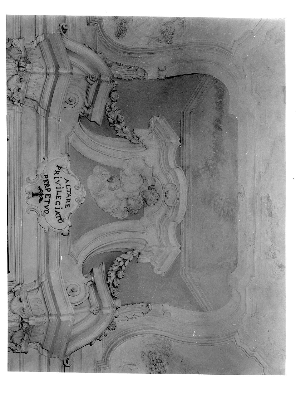 - ISCRIZIONI in un cartiglio sotto al frontone - ALTARE/ PRIVILEGIATO/ PERPETUO - lettere capitali - a caratteri applicati -