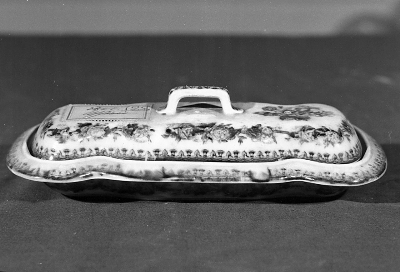 scatole in porcellana bianca di forma ovale sagomata, con decorazione blu a fiori e fasce composte di foglie alternate a vasi. Il manufatto è provvisto di coperchio avente al centro un manico rettangolare. La superficie presenta alcuni fori, mentre l'interno è suddiviso in tre scomparti
