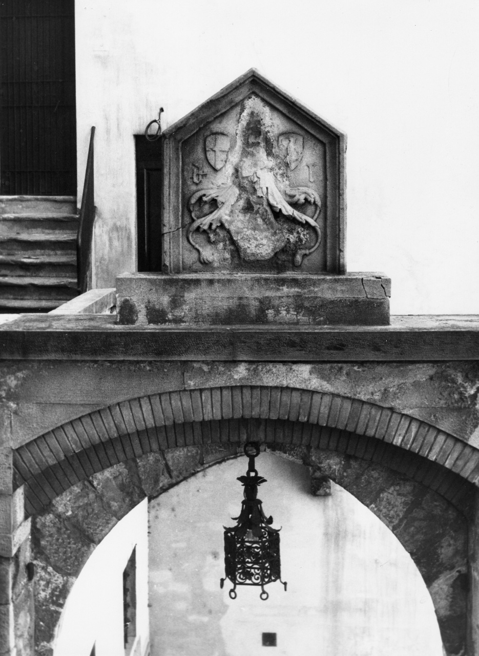 - STEMMI arco di accesso alla scalinata - gentilizio - Stemma - Lo stemma, a forma di scudo da torneo con tacca, ai lati del cimiero sono ricavati, sempre in bassorilievo due piccoli stemmi femminili riportanti, il destro un'aquila ad ali spiegate, ed il sinistro una croce tipo calvario in palo. Lo scudo è sovrastato da elmo con cimiero e svolazzi terminanti in nappe